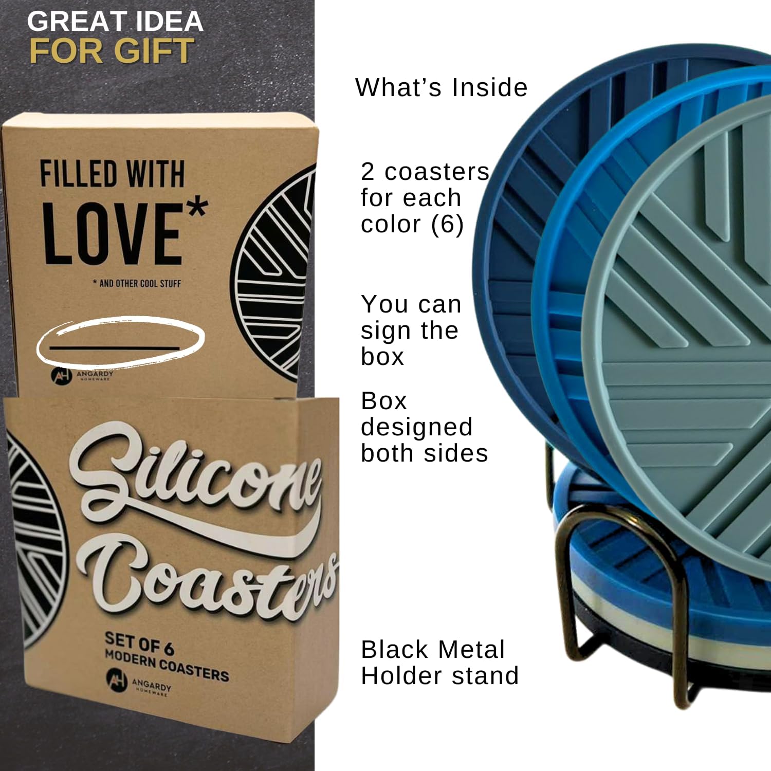 Coasters Set of 6 - Silicone Drink Coasters for Home Decor and Coffee Table Modern Elegant Blue Pattern - Round 4" Housewarming Gifts