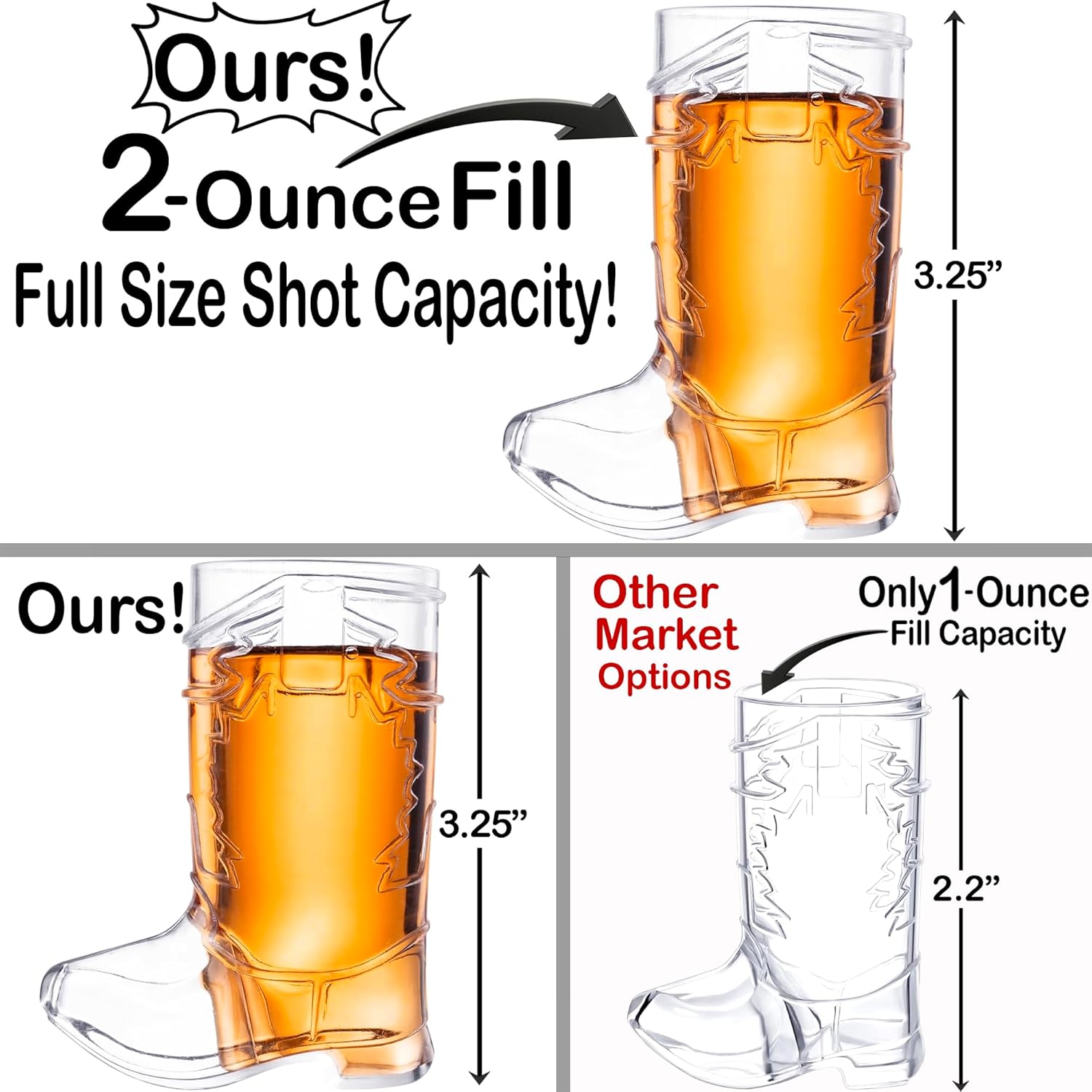 - 2 Ounce Plastic Cowboy Boot | Unlike other market options, each Cowboy Boot shot glass is made to hold a standard 2 ounce shoot. That’s twice the fun as other options!