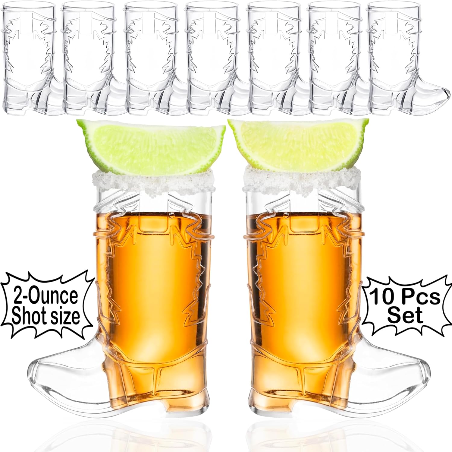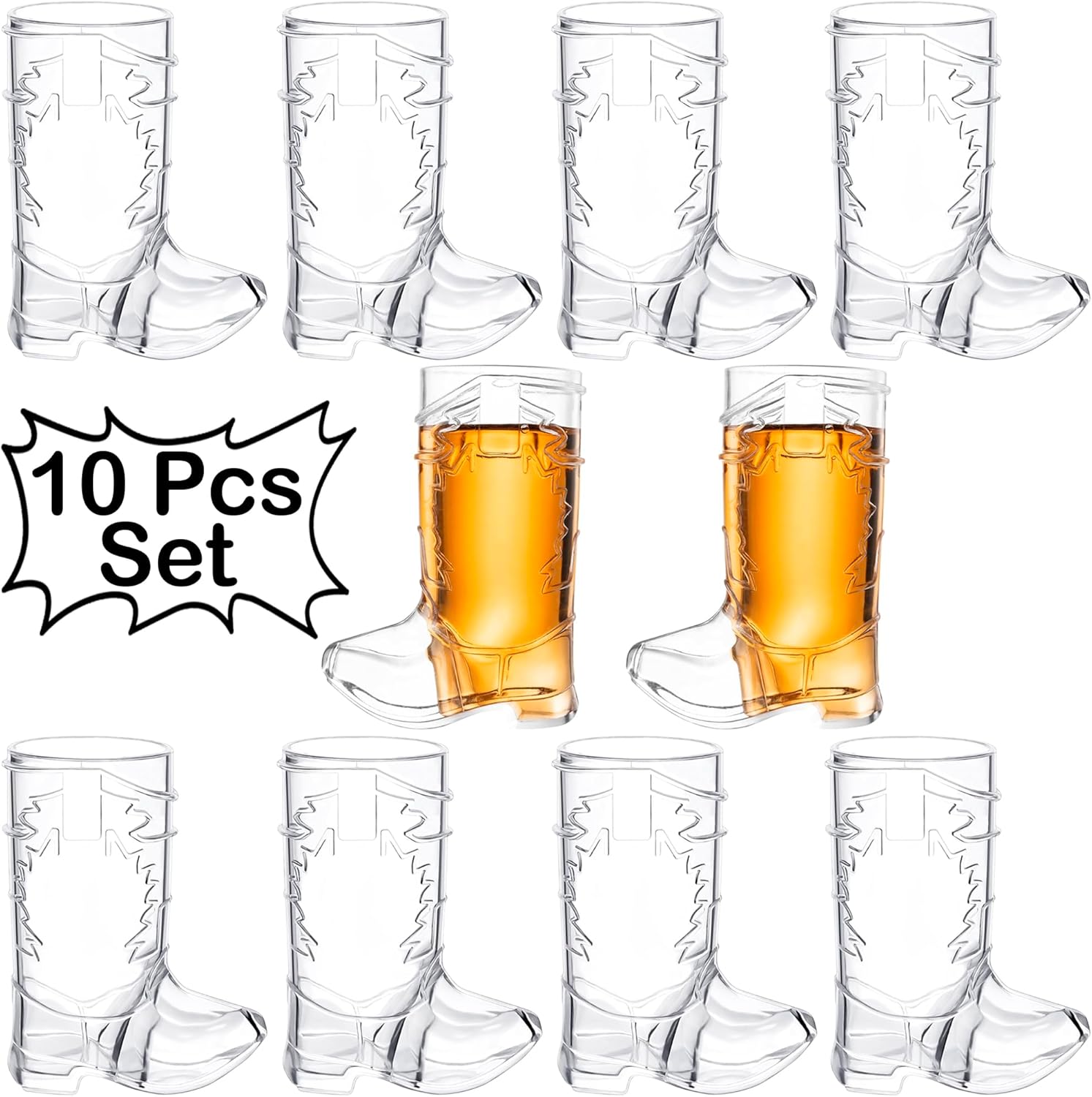- Party Pack | That’s correct, each package includes 10 (2 ounce) Cowboy Boot shot glasses. Plenty to pass around to guests and friends.
