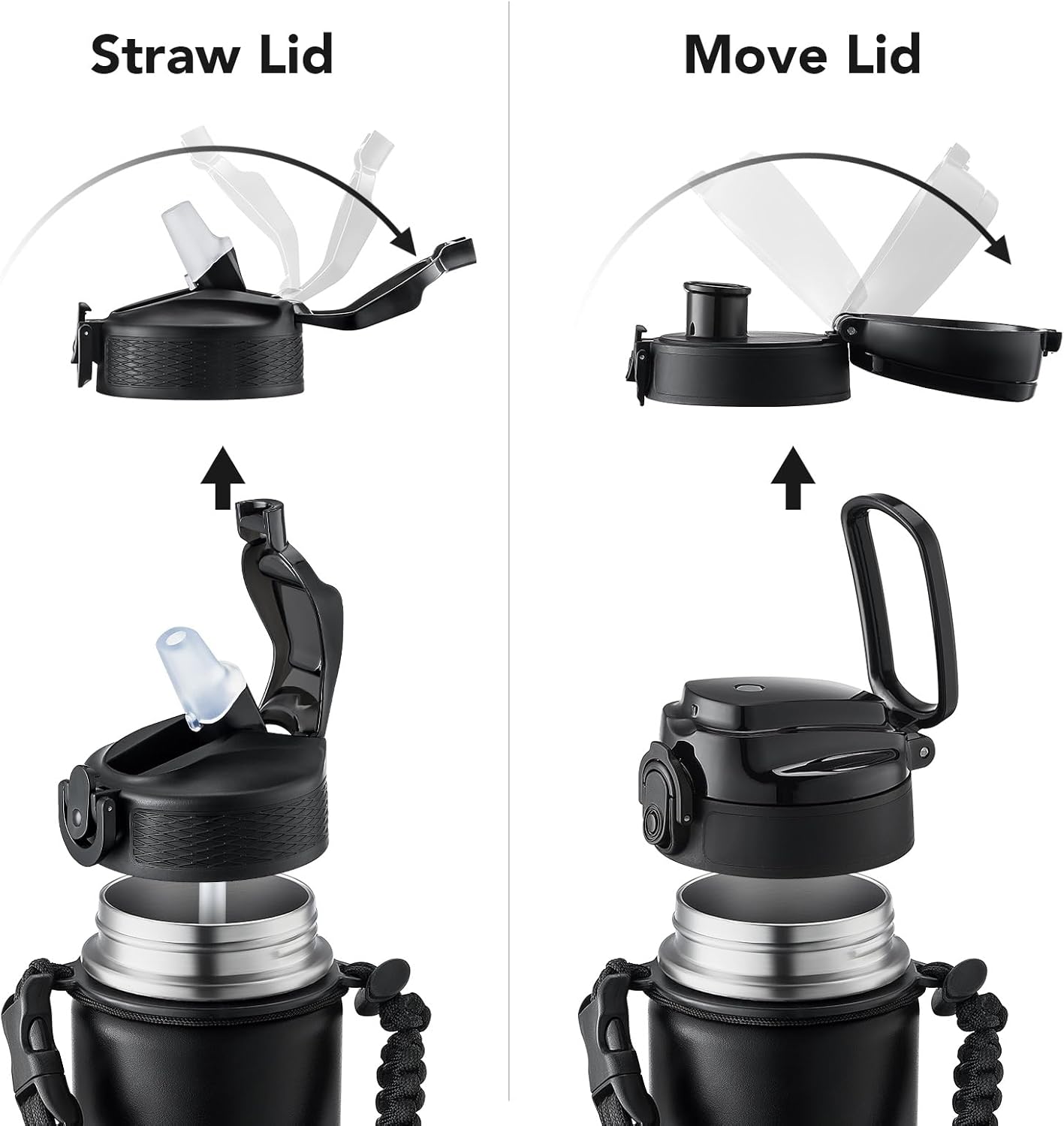- Insulated water bottle 24 oz: 24 oz insulated water bottle has a matte finish and comes with 2 lids (Lid with Straw/No Straw) and a Paracord handle for easy portability; Its wide mouth makes it easy to fill, pour, and clean, and the leak-proof cap ensures worry transport.