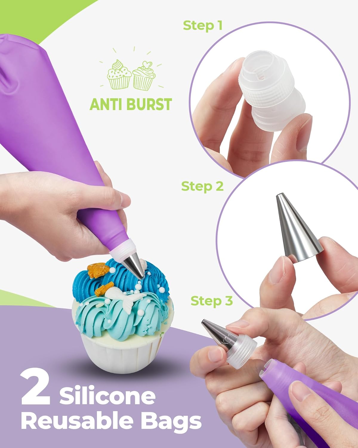 - 2 Kinds of 12" Pastry Bags: Including 12" reusable and disposable piping bags for easy cake decorating. 2 reusable piping bags with smooth interior design allows for easy cleanup, while the non-slip exterior provides a comfortable and easy grip. 20 disposable bags will enable you to discard them after finishing your baking, saving time on cleaning.