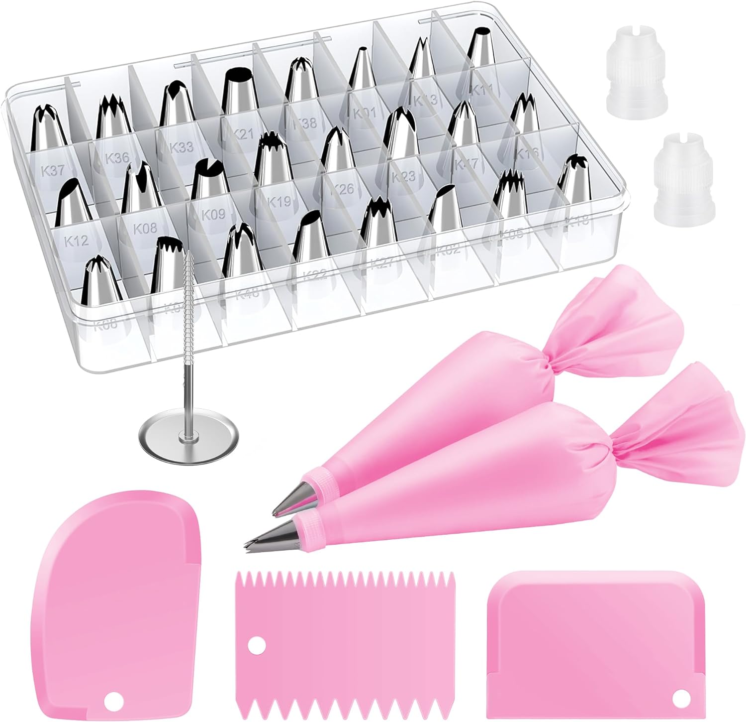 - Essential Cake Decorating Kit: 24 numbered & easy to use stainless steel piping tips, 2 reusable piping bags, 3 shapes of cake scraper, 2 reusable converters, 1 flower nail, 1 storage box that keeps everything organized. With just a few key baking tools, you'll be able to make cake decorating a piece of cake.