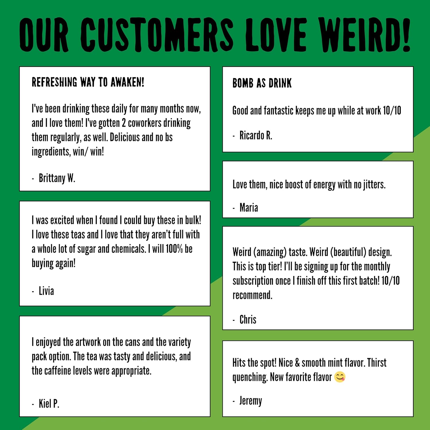 - 🌎 Sustainable & Eco-Friendly Packaging DRINK WEIRD comes in eco-friendly recyclable aluminum cans, because caring about the planet is part of the Weird way. Give a poop. Don’t pollute.
