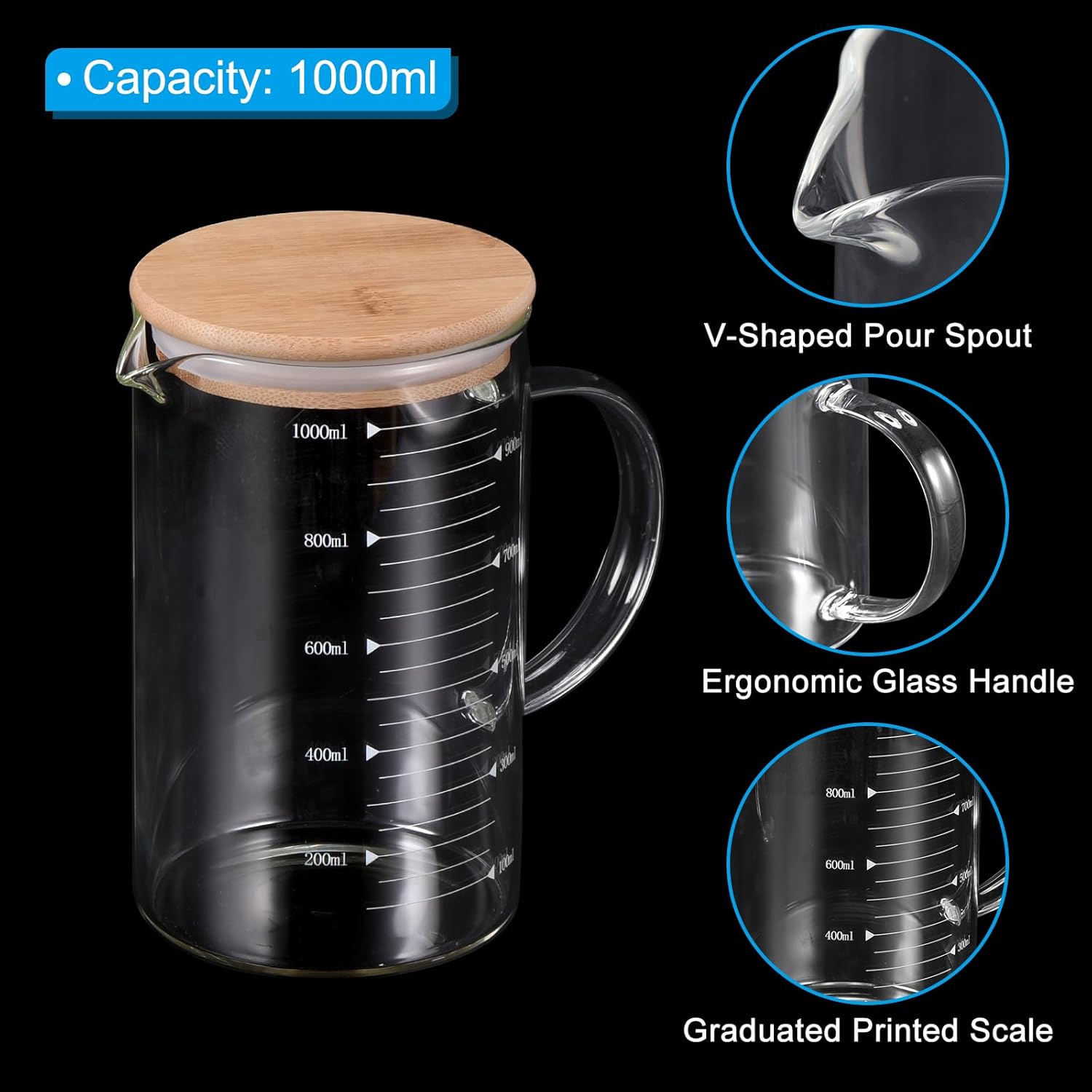 PATIKIL 1000ml Glass Measuring Cup, 3.3 Borosilicate Glass Graduated White Printed Scale Liquid Measure Cups Beaker with Wood Lid and V-Shaped Spout for Kitchen