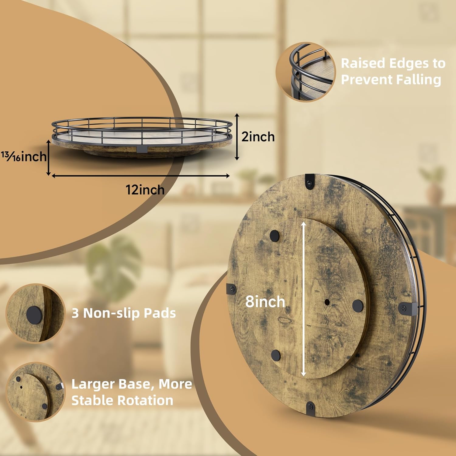 - Thoughtful Design - The raised edges are made of iron, which is sturdy and prevents items from falling off the turntable. The base is large enough and equipped with 3 anti-slip pads, the rotation is smoother and prevents scratches. No installation required, easy to use
