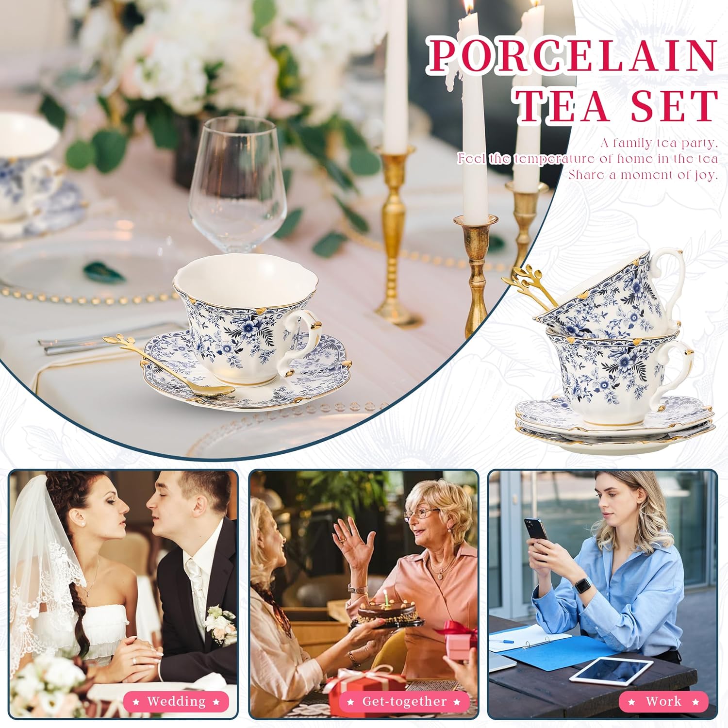 - 8.5 Ounce Bone China Porcelain Tea Cup and Saucer, Assorted colors, Floral Pattern, Set of 6