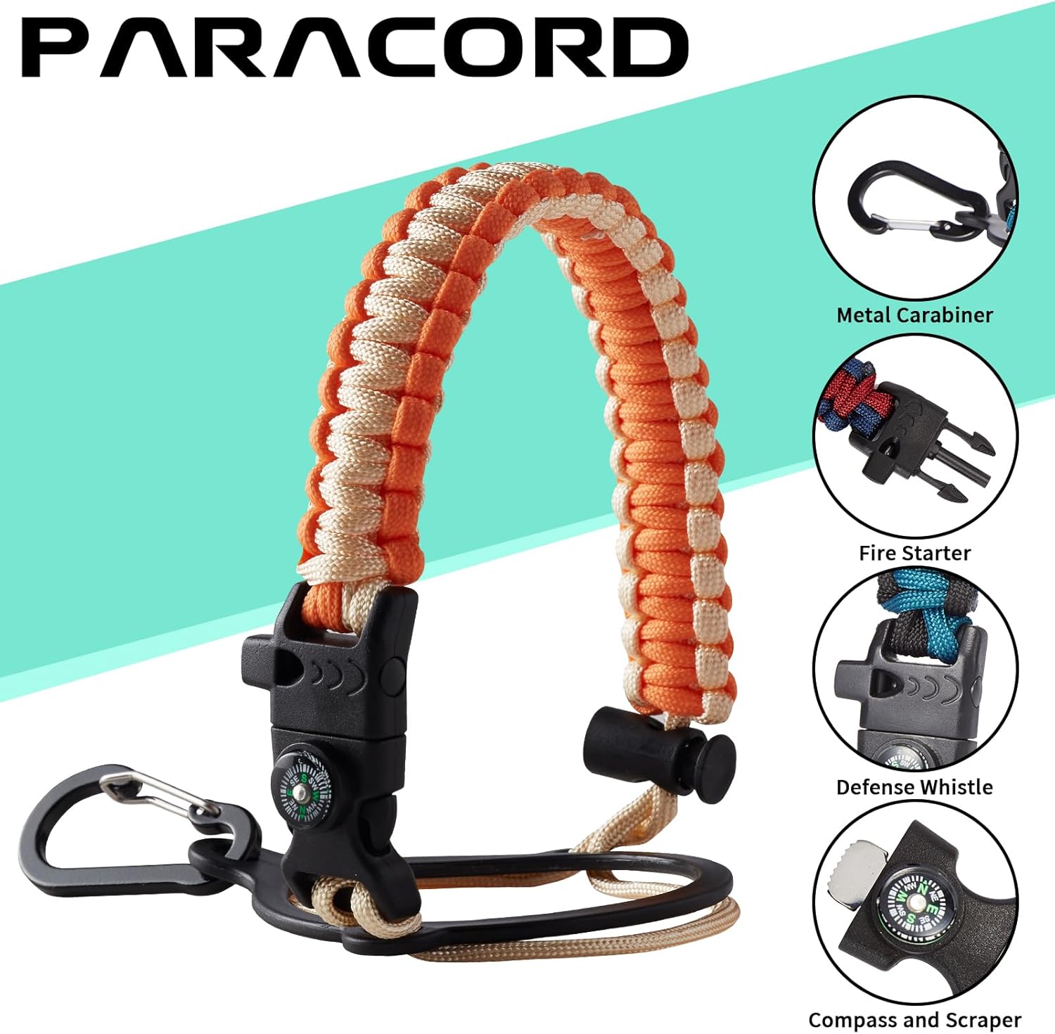 - UNIQUE DESIGNS PARACORD HANDLE: Full-function paracord handle made in individual styles to match the color of the flask water bottles. With compass, safety ring, carabiner, flint fire starter & whistle. It unravels into a sturdy and taut rope in an emergency, making the large water jug an ideal survival kit for expeditions in the wild