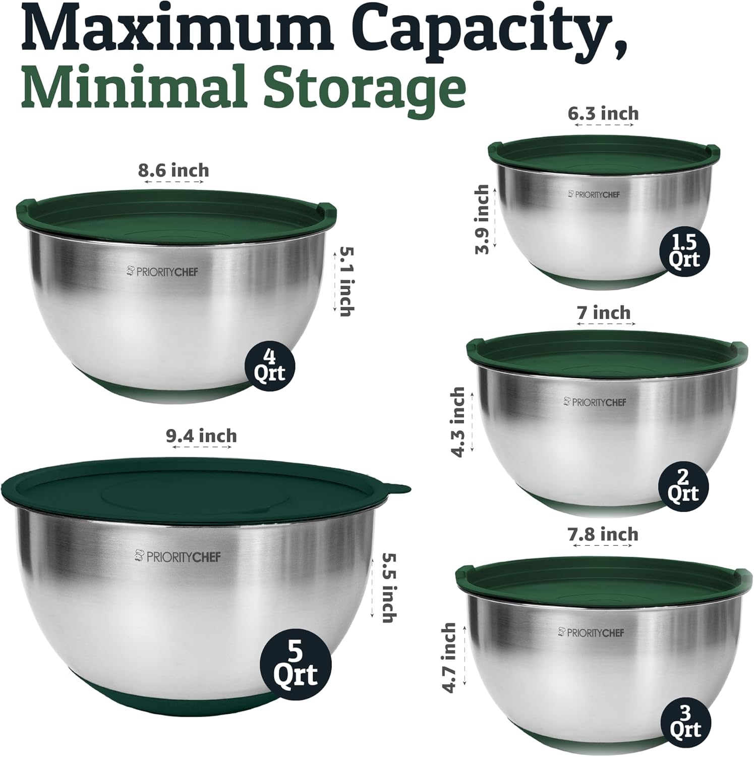 Priority Chef Stainless Steel Mixing Bowls with Lids Set, 3 Grater Attachments, Airtight Lids, Non-Slip Silicone Base Mixing Bowl Set, Large Prep Metal Mixing Bowls for Kitchen, Green