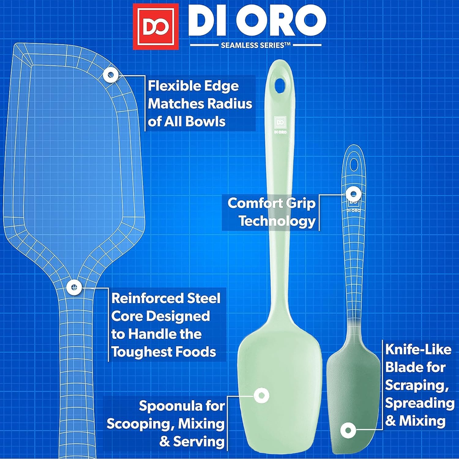 - CLEANS EASY, SEAMLESS ONE-PIECE DESIGN – You will be happy to know that your Award-Winning DI ORO Seamless Series Spatulas are dishwasher safe or can be quickly and effortlessly cleaned by hand. The one-piece seamless silicone design prevents buildup of food and grime, which allows for safe and healthy cooking.