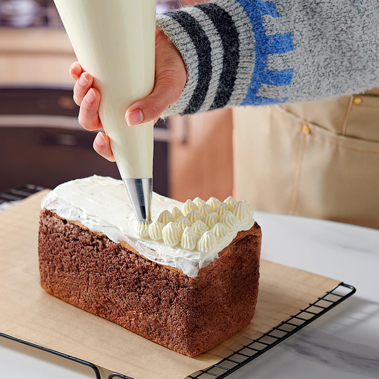 - These pastry bags are perfect for piping buttercream, royal icing, choux pastry and fresh cream to decorate cakes, cookies, cupcakes and other iced desserts with or without a tip. The bag capacity is ideal for large jobs like decorating toppings on a good number of cupcakes or decorations onto a large surface area without having to refill the bag.