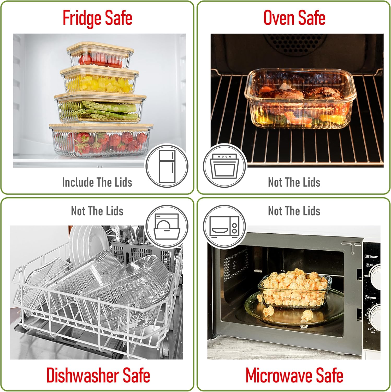 Ribbed Glass Tupperware Set with Bamboo Lids - 4 Stackable Meal Prep Containers. Durable heat resistant Inert Borosilicate Glass