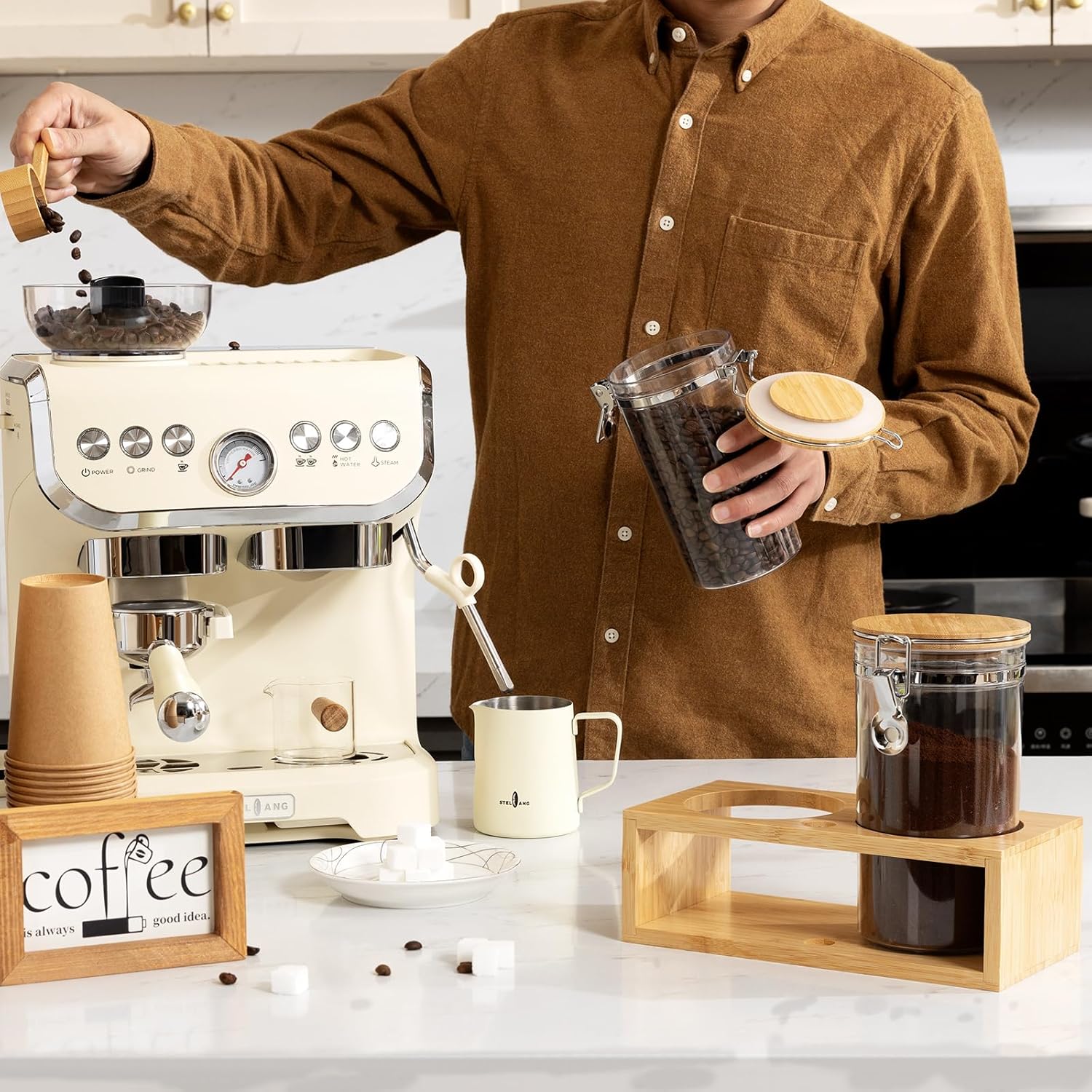 Yangbaga 2Pcs Coffee Sugar Canisters with Shelf, 38OZ Plastics Storage Containers for Ground Coffee Bean Storage with Lid Airtight Locking Clamp and Coffee Scoop, Food Storage Jar for Kitchen