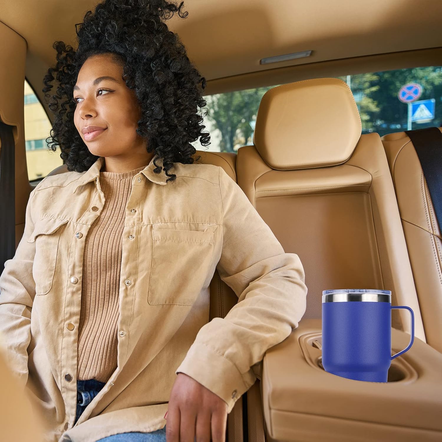 - Cupholder Friendly: The travel coffee tumbler 20oz is designed with a tapered shape which fits most car cup holders, equipped with a sturdy handle that allows easy carrying. Diameter 3.38" large cup mouth makes it easier for you to clean the stainless steel mug.