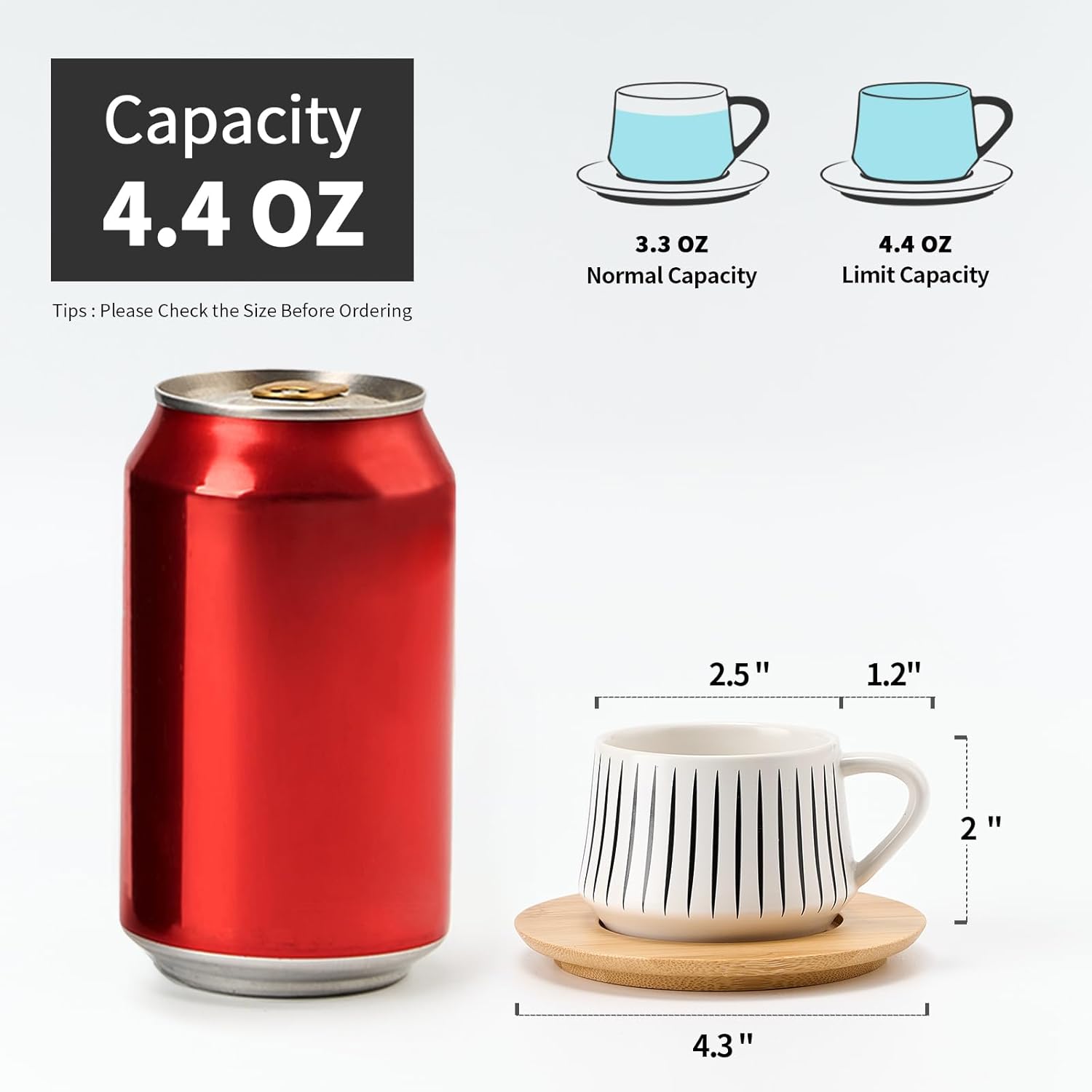 - 【SAVE COUNTER SPACE】 Each Cup: Dia:2.5", H:2". Capacity(full): 4oz /130 ml. Each saucer: Dia:4.3 ", H:0.5 ".The combination of the coffee cup set and the iron frame can prevent the cups and saucers from being randomly placed.They are the best collocation in your life.