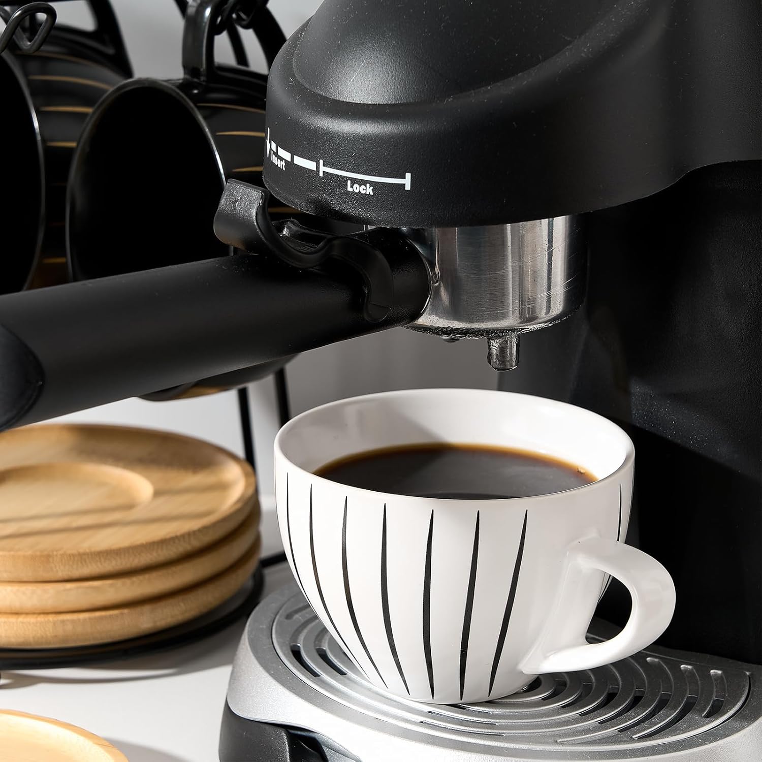 LUKA Ceramic Demitasse Espresso Cups Set with Saucers and Metal Stand, 8 oz Porcelain Cappuccino Cups Teacup For Tea, Espresso, Latte, Coffee, Cafe Mocha, Set of 4, Stripe White & Black