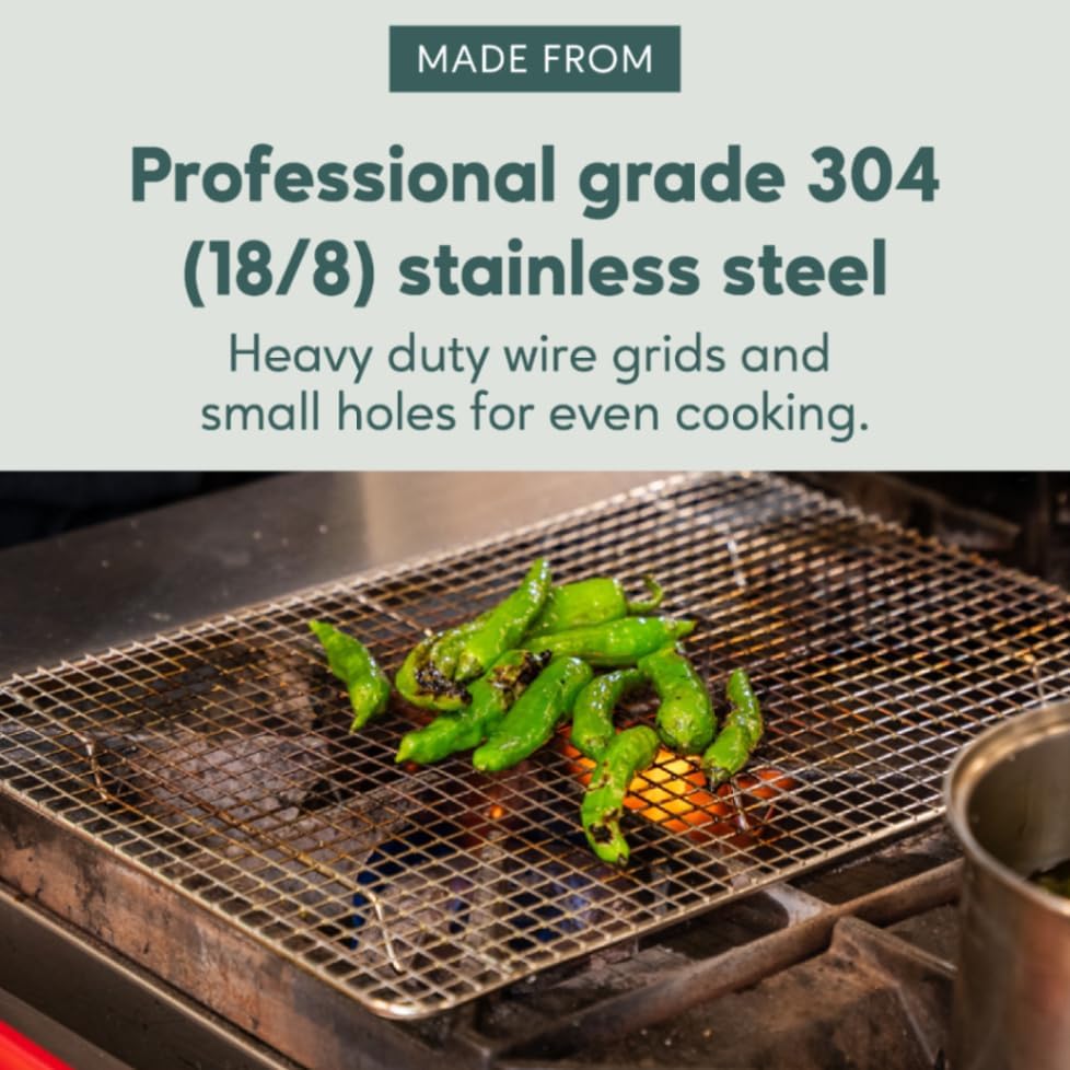 - HEAVY DUTY STAINLESS STEEL STURDY DESIGN: Small cooling rack for jelly roll baking pans are food-safe, professional grade 304 (18/8) stainless steel with strong, heavy duty wire grid, small holes, smooth no-snag edges, and a full 1 inch height resulting in greater all around airflow for even cooking, cooling and roasting every time