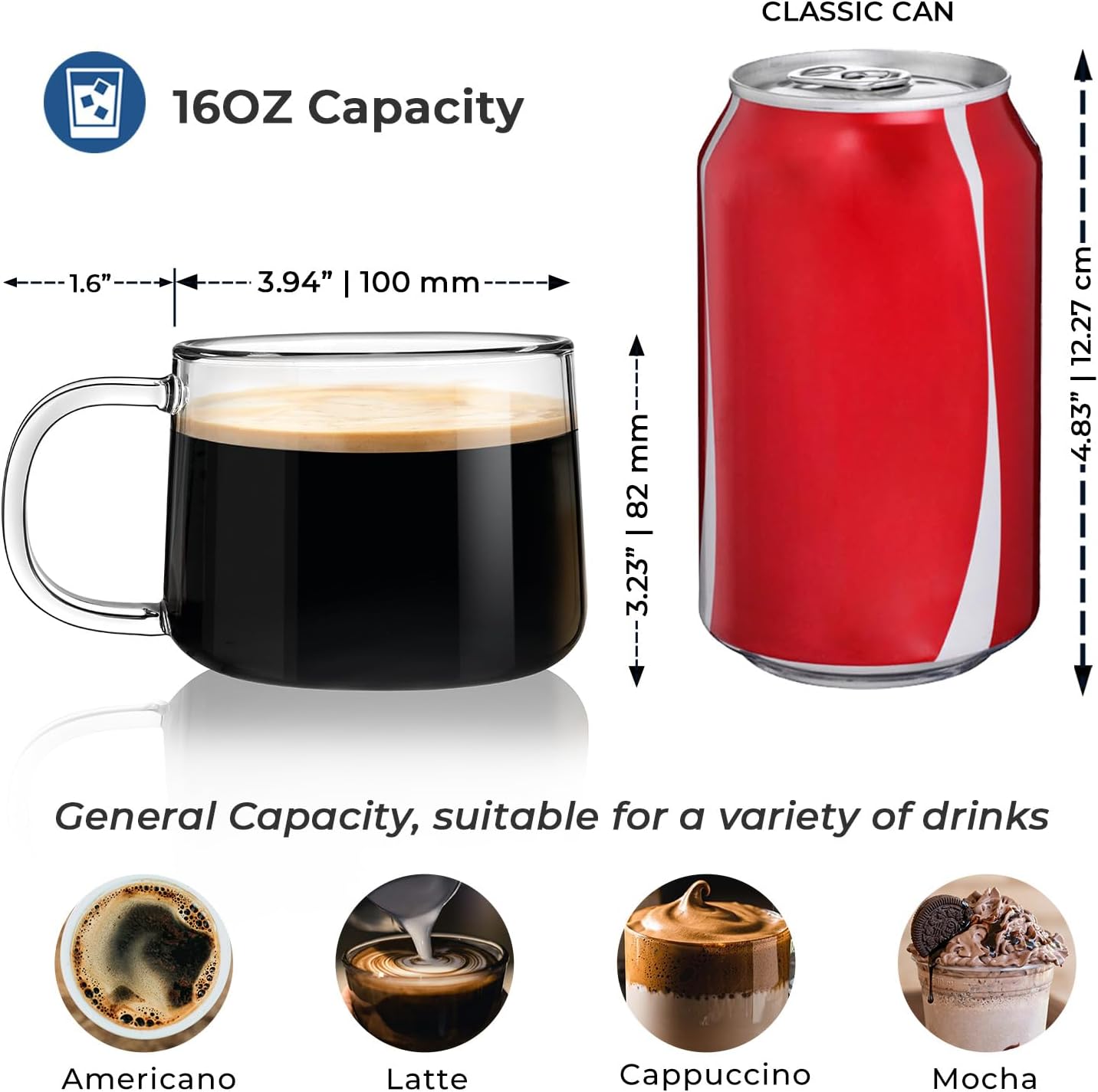 Aquach 16 oz Glass Coffee Mugs with Handle Set of 2 - Large Clear Glass Cups for Latte, Cappuccino, and Tea