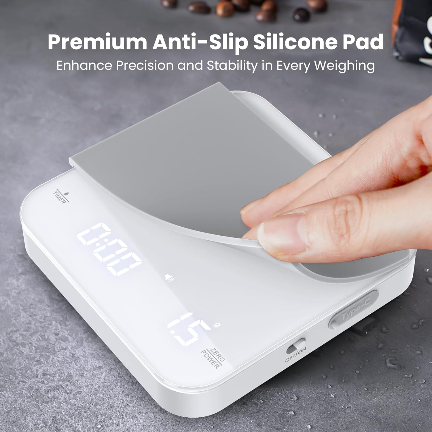 - 【Silent Brewing】Experience a tranquil coffee morning with our coffee scale's Mute Function. Press and hold the TIMER and ZERO buttons for approximately 2 seconds to deactivate the beeping sound, allowing you to enjoy a peaceful start to your day