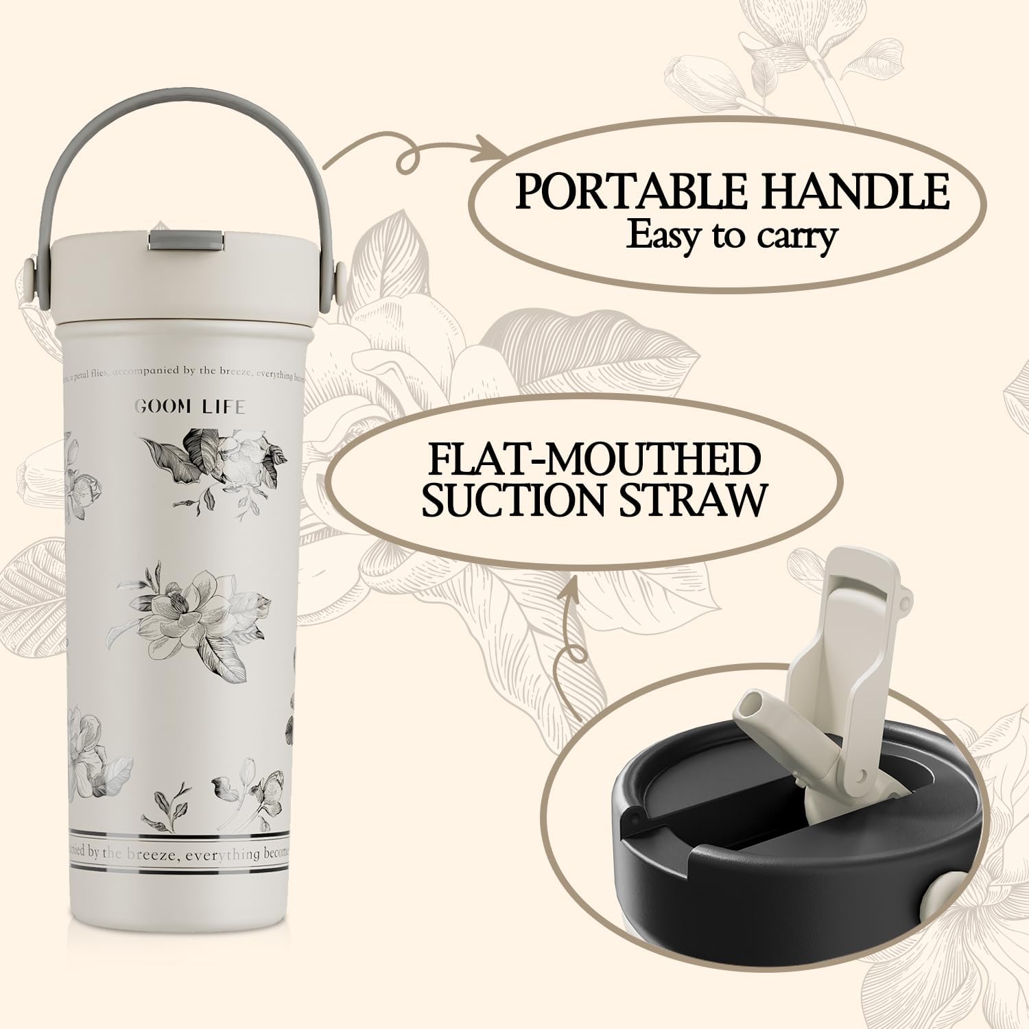 GOOM 20 oz Spill Proof Tumbler with Lid and Straw, Top Handle, Extended Tea Infuser, 18/10 Stainless Steel, Insulated Hot & Cold Brew Gifts for Mom Women Her, Teacher Gifts - Floral White
