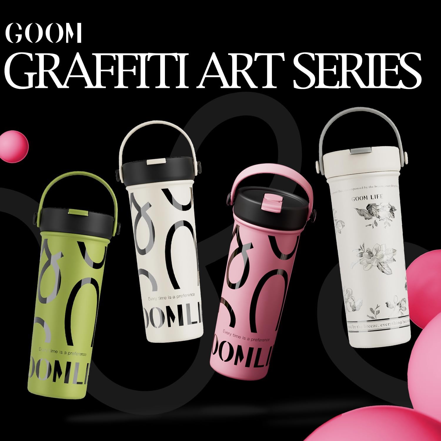 - REDEFINING DRINKWARE WITH STYLE: Forget those uninspired, one-size-fits-all designs. Insulation, leak-proof, and spill-free? Come on, that’s just the basics—but elegance, boldness, and a design that turns heads? That’s what sets GOOM apart. While others play it safe, we push boundaries with fresh, trendsetting designs every single month. Hydrate in style, everybody—because ordinary just isn’t an option!