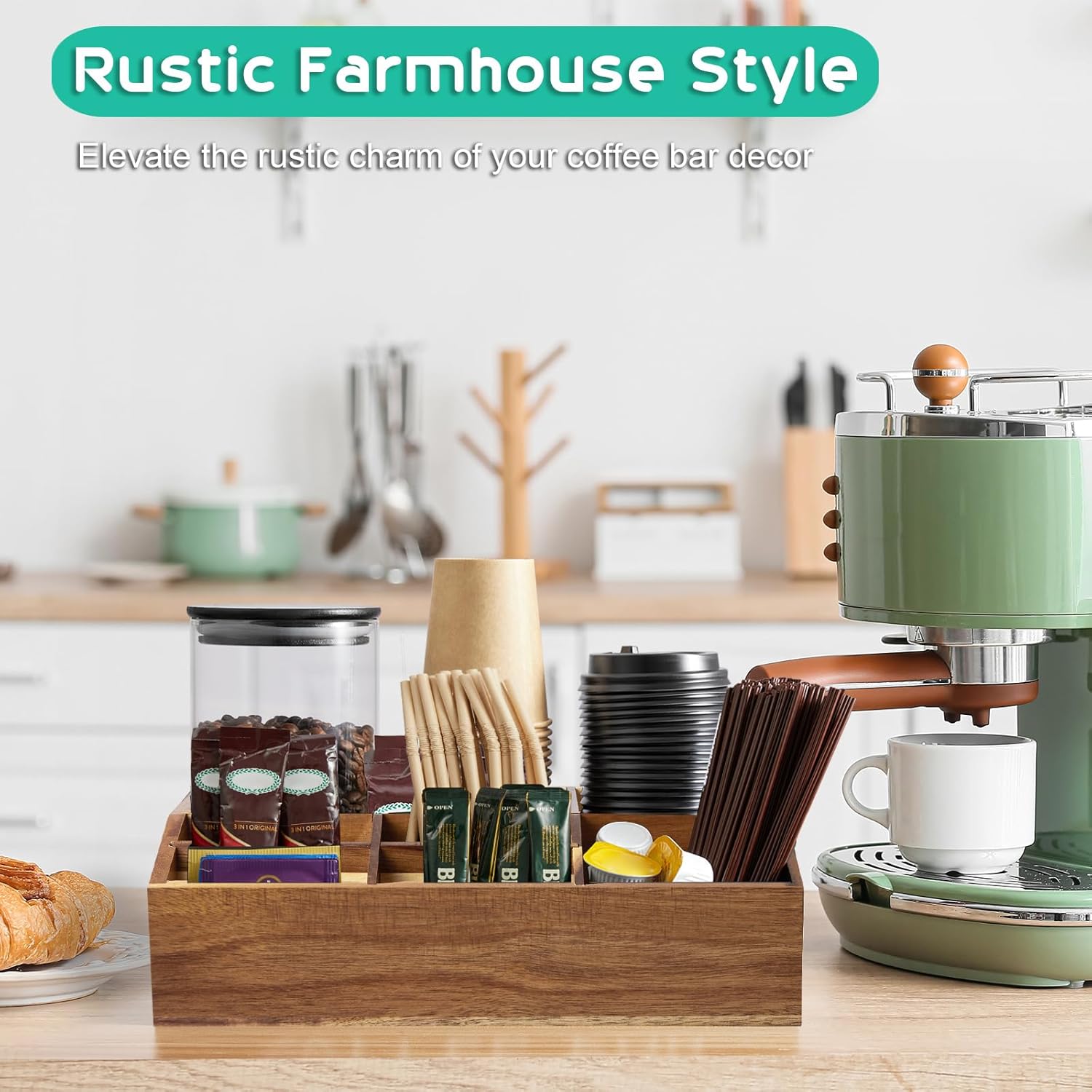 ALELION Acacia Wood Coffee Station Organizer for Countertop - 7 Compartments Coffee Bar Accessories and Organizer with Removable Dividers - Coffee and Tea Condiment storage Organizer