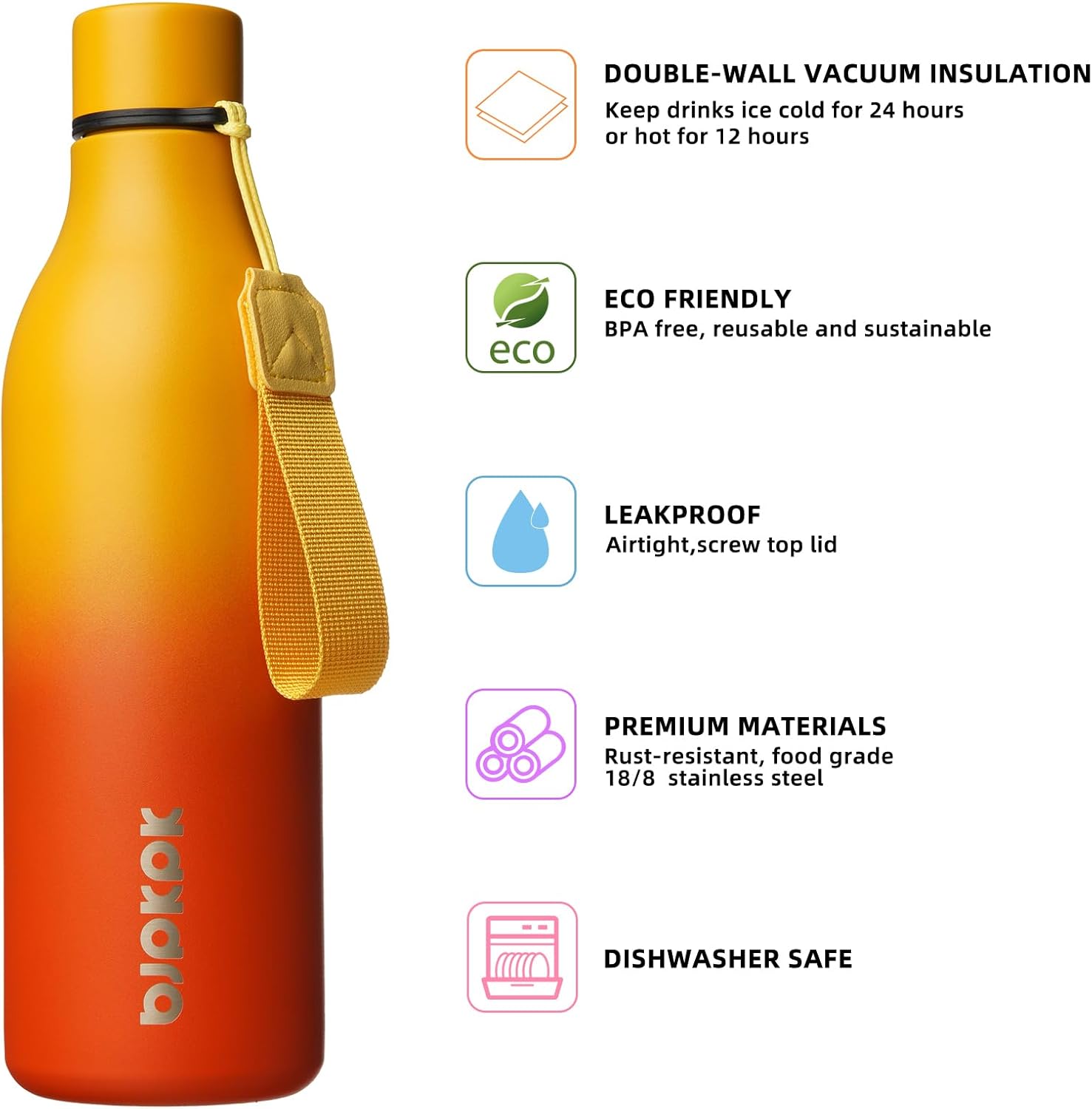 BJPKPK Insulated Water Bottles, 25 oz Stainless Steel Metal Water Bottle with Strap, BPA Free Leak Proof Thermos, Mugs, Flasks, Reusable Water Bottle for Sports & Travel, Sunset Orange