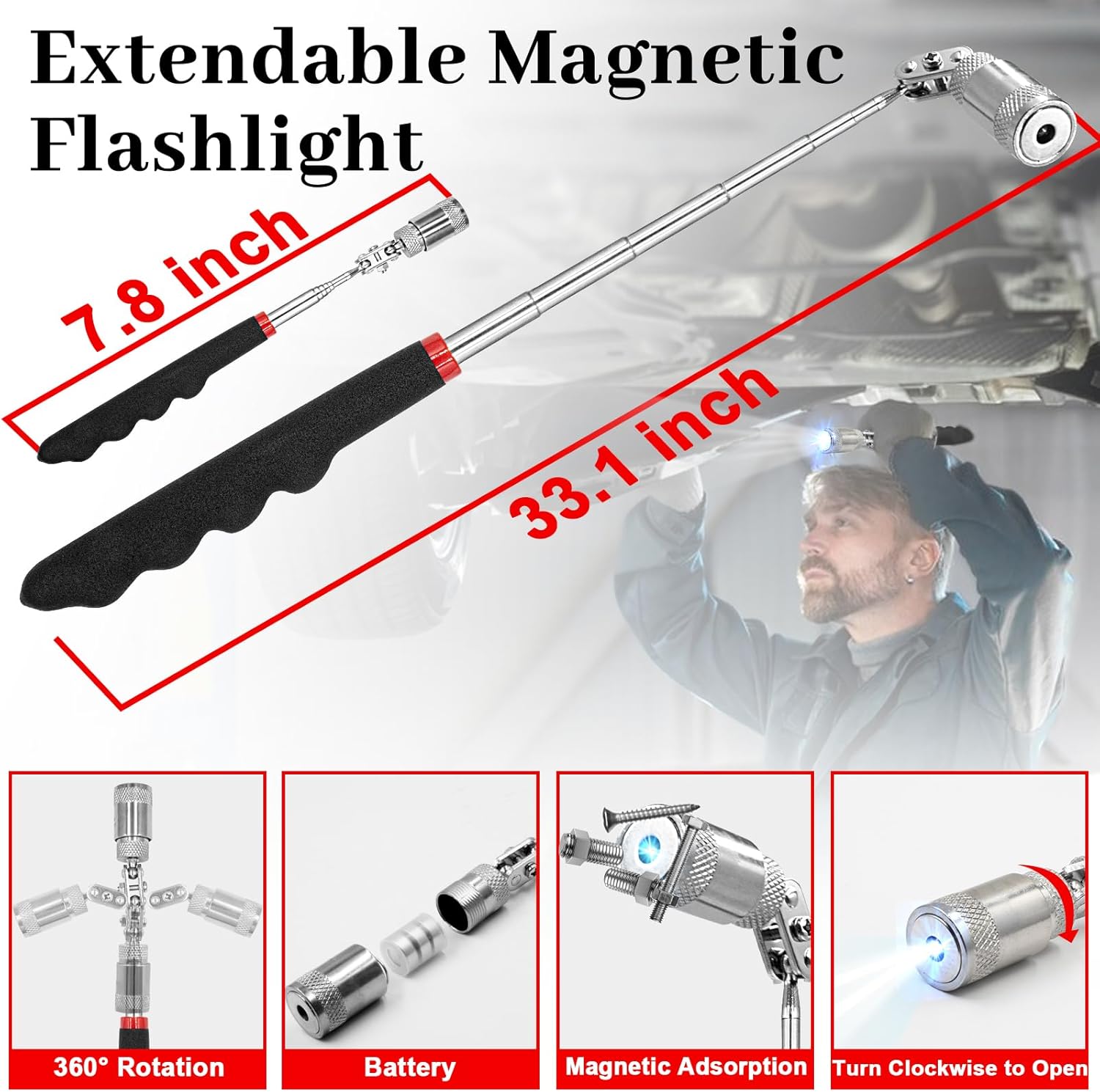 - Retractable Magnetic Pickup & hook/pick set – Telescoping Magnetic Pickup (up to 22.8 inches) grabs dropped screws/nuts from tight spaces,while ergonomic hooks reach hidden wires and hoses,Easy disassembly springs,moldings,auto oil seals,o rings washers