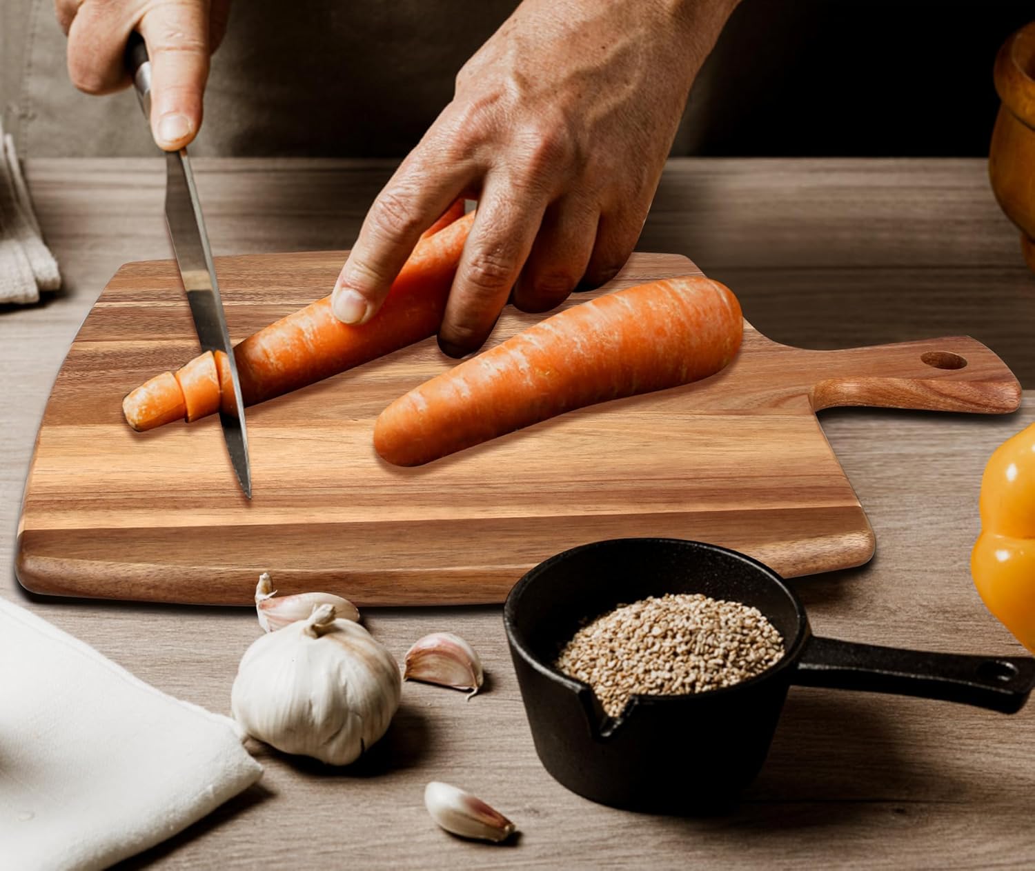- 100% Acacia Wood: This chopping board is made of food-grade acacia wood which is a sustainable material that doesn't harm our environment. Acacia is famous for being virtually indestructible, the wood has a beautiful natural polish and a sweet smell. No BPA, PVC or toxic finishes.