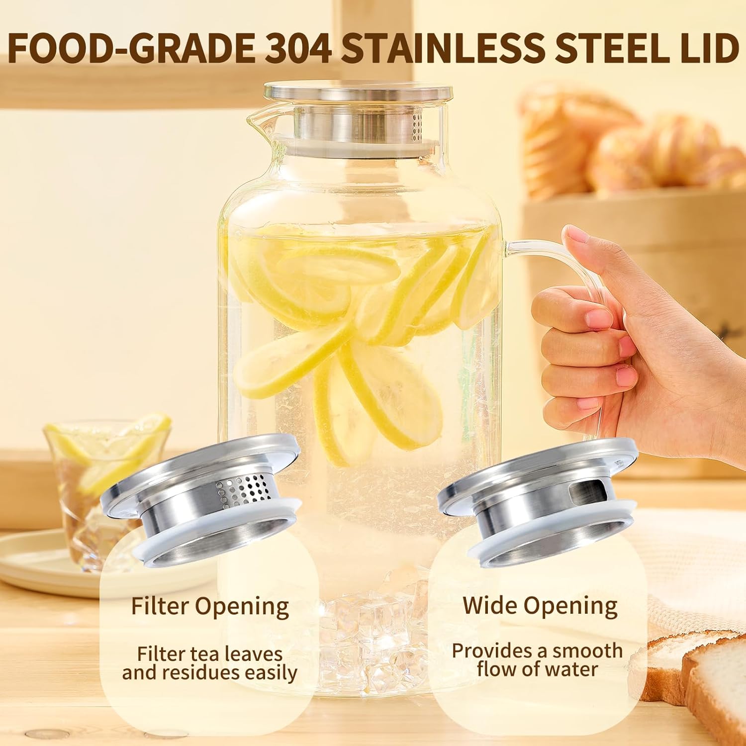 - [Stainless Steel Lid with Two Different Pour Functions]: You can utilize the large opening to effortlessly pour water or flip it over to filter the water, keeping ice or fruit inside the pitcher. Its food-grade sealing ring prevents leaks, and the lid stays securely in place during pouring.