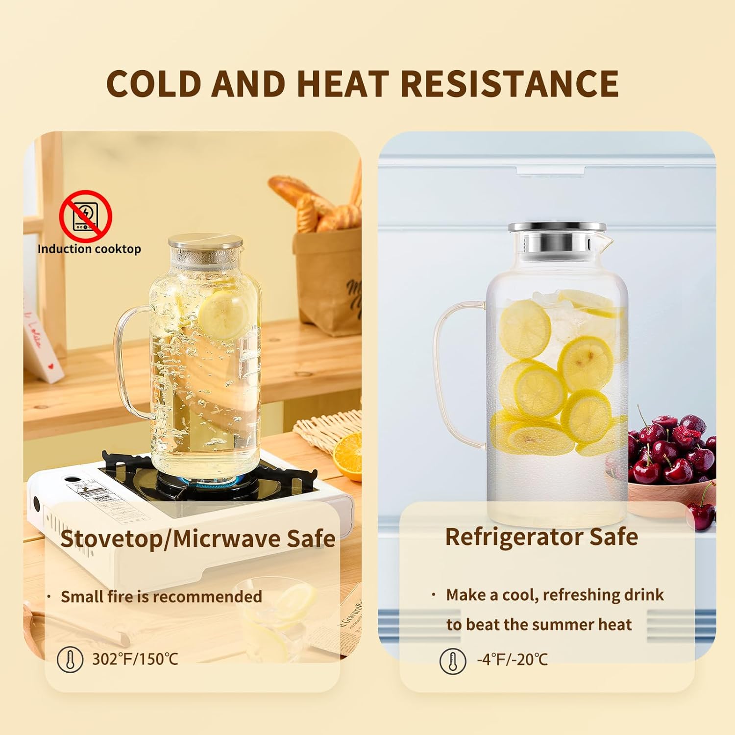 - [Temperature-Resistant Construction]: Our glass pitcher is designed to withstand high temperatures ranging from -4°F to 302°F, making it suitable for use on gas and electric stoves, as well as in refrigerators. You can safely pour boiling or ice water into it.