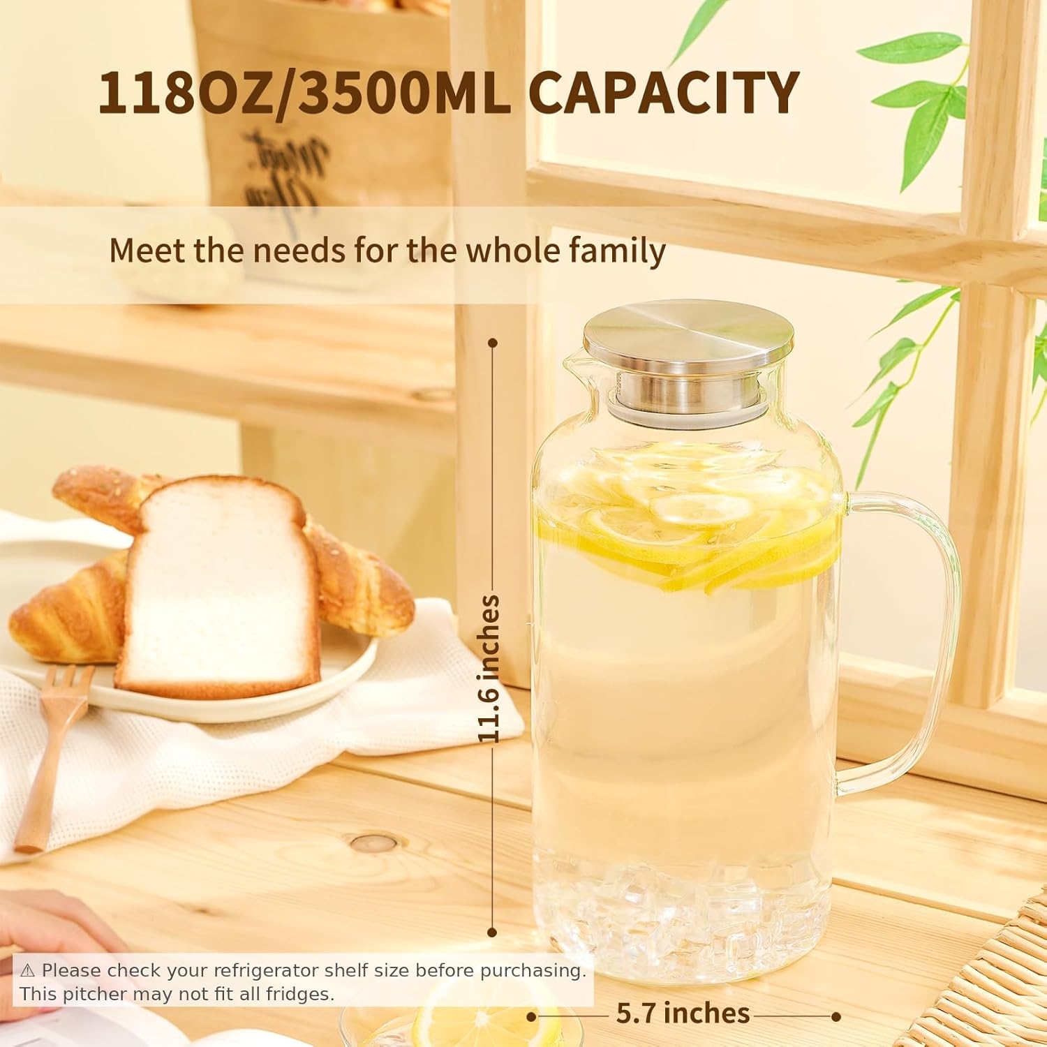- [Spacious 3.5L/118oz Capacity]: With a generous 3.5L capacity, our pitcher is perfect for restaurants, parties or daily use. Its ample size reduces the need for frequent refills, saving you time and effort. It can hold water, milk, coffee, fresh juice, wine or any other beverage. [Note]: Please check your refrigerator shelf size before purchasing. This pitcher may not fit all fridges.