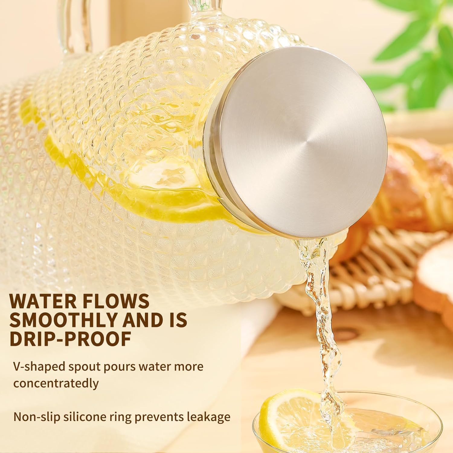 - [Safe and Sturdy Glass Material]: Our pitcher is crafted from premium high-grade borosilicate glass, ensuring it's 100% free of lead, heavy metals, and toxins. With a sturdy 3mm thickness, our pitchers are built to last, ensuring enduring durability.