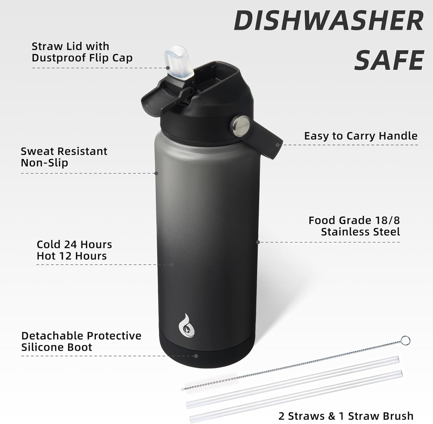 - NON-SLIP PROTECTIVE BOOT & DISHWASHER SAFE: This stainless steel water bottle comes with a detachable silicone boot to protect the bottom from bump damage. The wide mouth design of our water cup allows for easy filling, pouring, and cleaning. With 2 straws and 1 straw brush, you can easily clean the nozzle and straw with straw brush. It is also dishwasher safe, saving you time and effort in maintaining its cleanliness and hygiene
