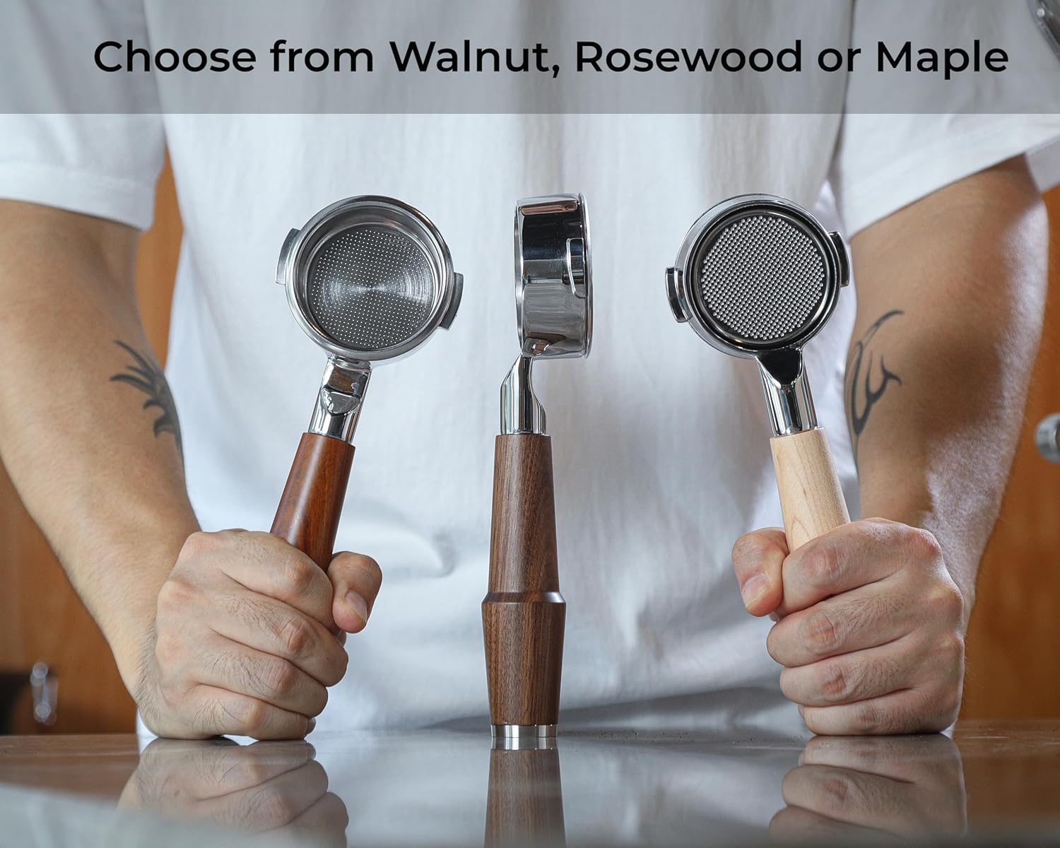 - Handcrafted Walnut Handle – Dark, smooth walnut wood for a classic barista look and ergonomic comfort during tamping.
