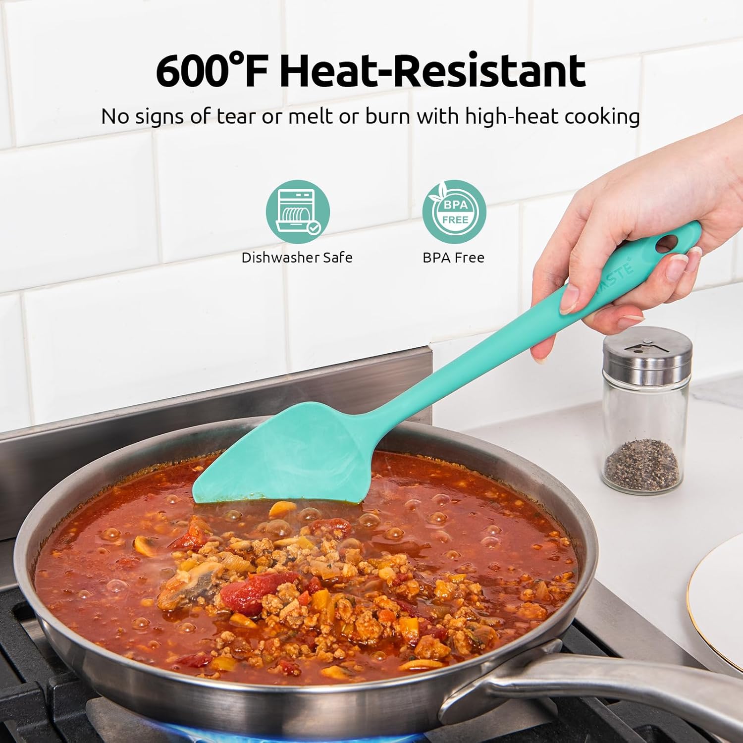 - [Seamless integrated design for easy cleaning] Are you tired of the handle of your current two-piece silicone spatula frequently separating? Now, try this dishwasher safe seamless utensil set, you don't need to worry about it coming apart and crevices for dirty stuff to hide. With flat surface, great for spreading frosting or icing on a cake.