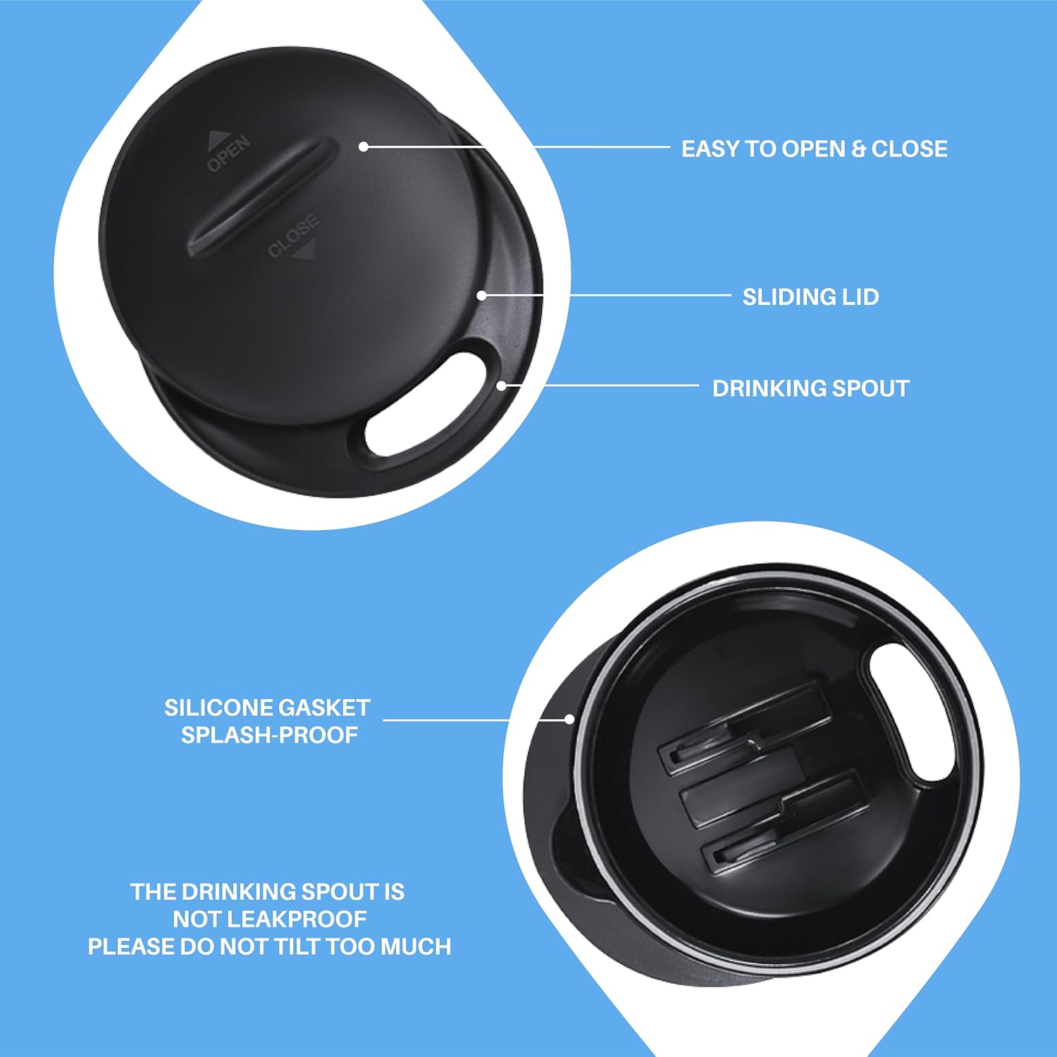 - 【PRESS-IN LID】- Silica gasket seals to achieve maximum spillproof capability. Drinking hole on the top, with a splash-proof sliding cover. Please note it is to keep drinks contained and prevent heat/cold from escaping. It is not leakproof.