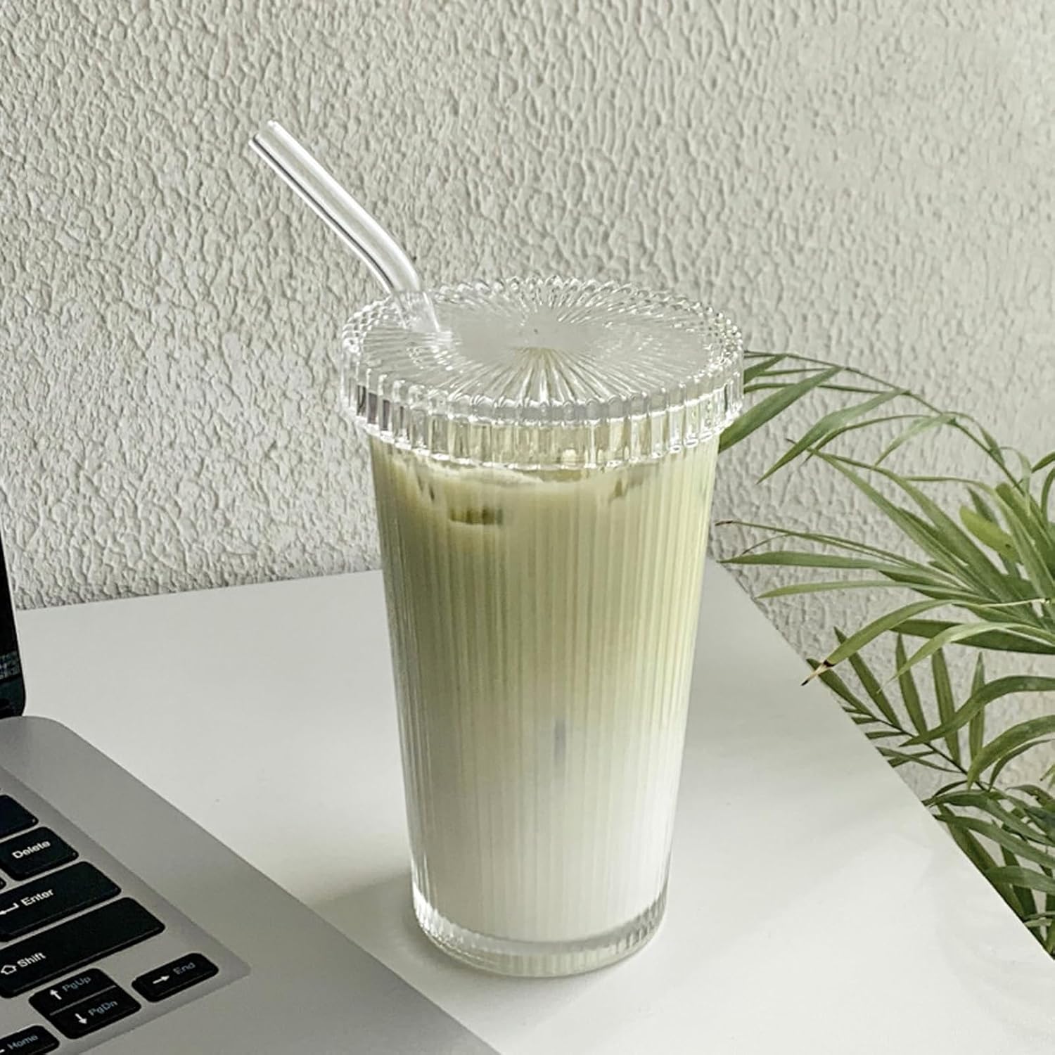 13oz Clear Iced Coffee Cups with Lids, Clear Glass Tumbler with Straw & Lid, Ribbed Glassware Cups, Dishwasher Safe Drinking Glasses, Stylish Glass Cups for Coffee, Juice, Tea, Matcha