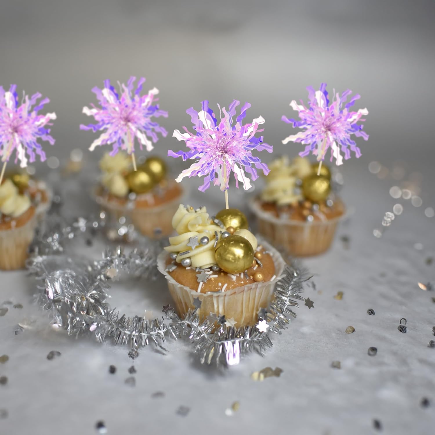 Gyufise 30Pcs Foil Firework Cupcake Toppers Happy Birthday Cake Toppers Tinsel Flower Drink Stirrers Cocktail Food Fruit Toothpicks for Valentine's Day Party Birthday Wedding Supplies Purple