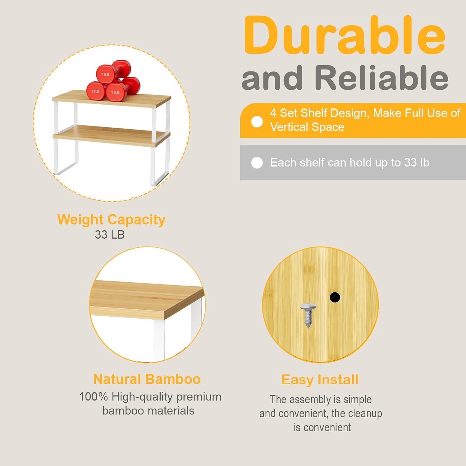 Cabinet Shelf Organizers, 15.7 inches Large Kitchen Counter Shelf, Set of 4 Wood Kitchen Pantry Organizer, Storage Shelves for Countertop, Spice Rack, Stackable, Expandable, Metal White, Nature