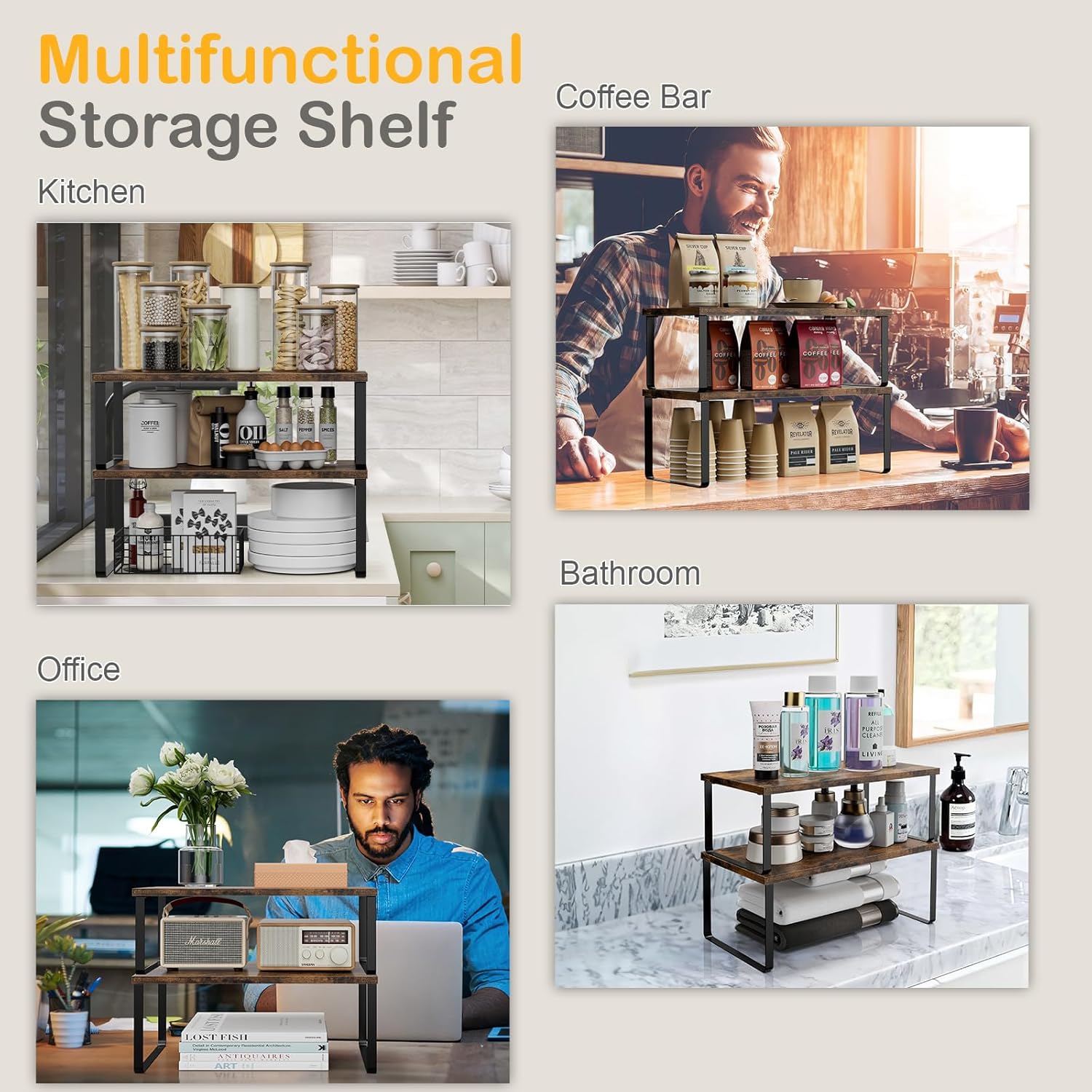 - Versatile Selves: More than just a spice rack, it serves as a versatile kitchen organizer; 4 sets of cabinet shelves are ideal for use in kitchens, bedrooms, desk, pantry, bathrooms, coffee bar inside cabinets and under sink storage, solving cabinet storage woes