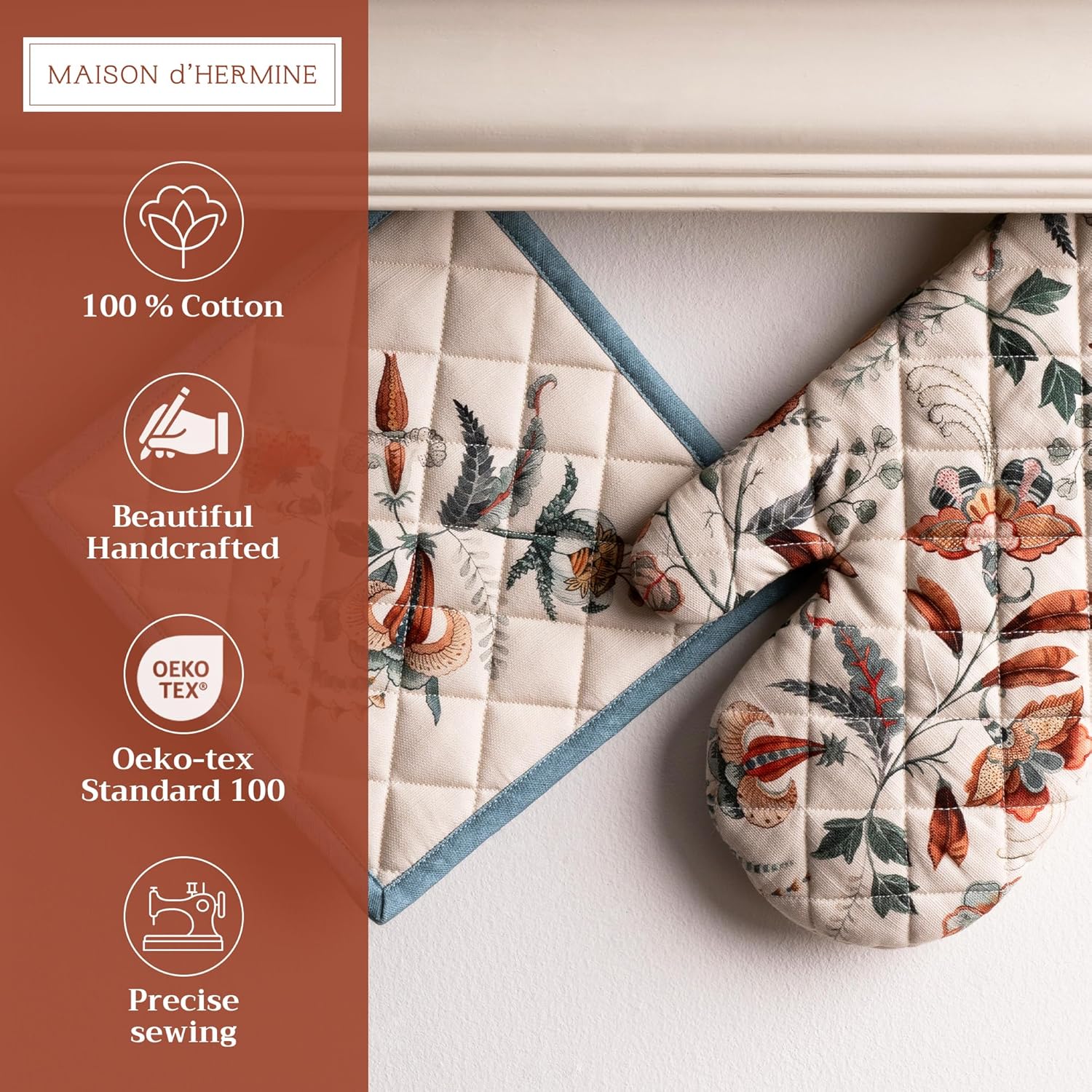 Maison d' Hermine 100% Cotton Oven Mitt & Pot Holder Set (7.5"x13" & 8"x8") Heat Resistant BBQ Cooking Gloves with Loop, Baking, Grilling, Kitchen, Handling Hot Pans (Dalida)