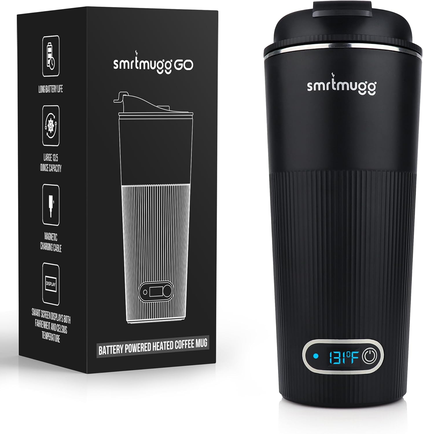 GO Heated Coffee Mug, Travel Mug, 13.5 OZ. Smart Mug, Battery Powered Heated Coffee Mug, Great for Coffee and Tea, Snap on Magnetic Charging Cord, New and Improved (Black)