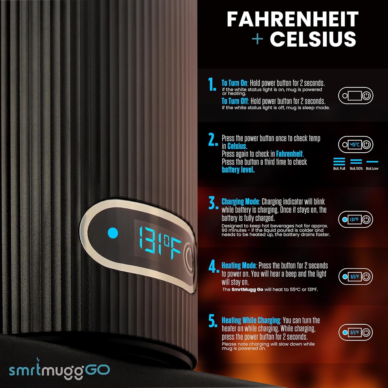 - ✅ Smart Display shows both Fahrenheit and Celsius Temperatures. Also displays current temperature inside the Coffee Mug, as well as battery life remaining.