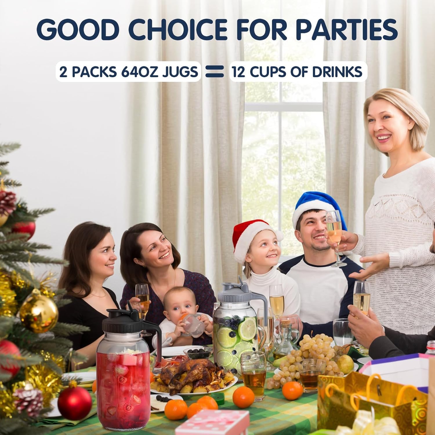 64OZ Glass Pitchers with Lid, Wide Mouth Water Jugs, Leak-Proof Airtight Mason Jars for Cold Brew Coffee, Iced tea, Milk, Food Storage, Sun Tea Jar,Set of 2.