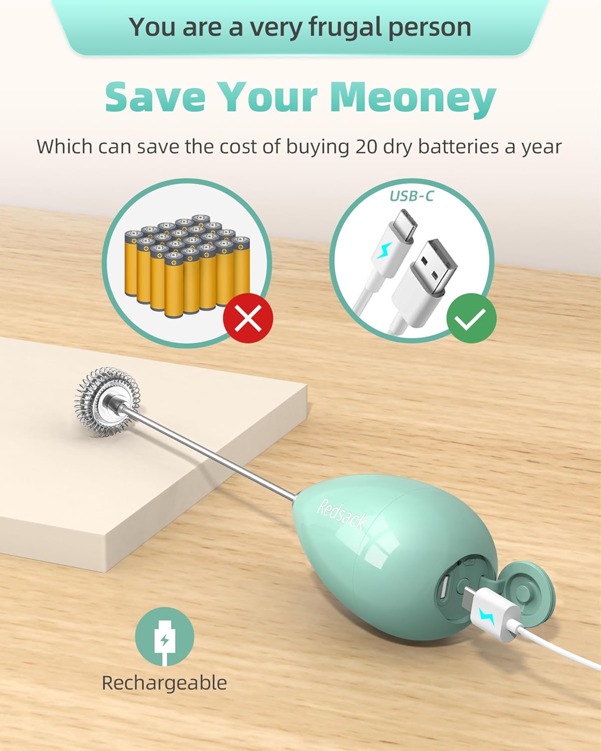- 【You are a very frugal person】 so we use safe rechargeable batteries, which can save the cost of buying 20 dry batteries a year, and a full charge can make milk foam more than 100 times,save your meoney