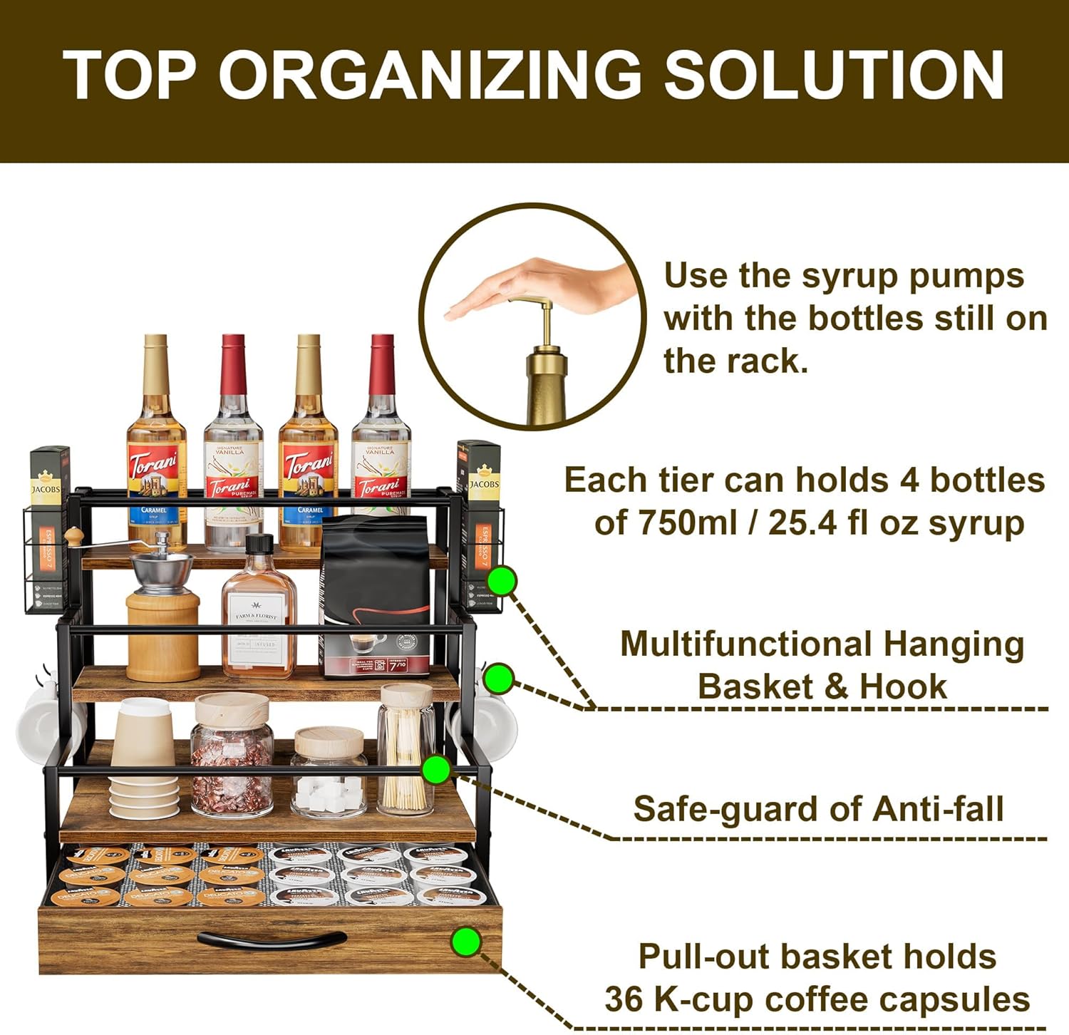 Coffee Syrup Organizer Rack, 4-Tier Syrup Bottle Holder Stand with 36 K Cup Pod Drawer Storage for Coffee Bar, 12 Bottles Storage Shelves for Syrup, Wine, Dressing for Kitchen Coffee Station