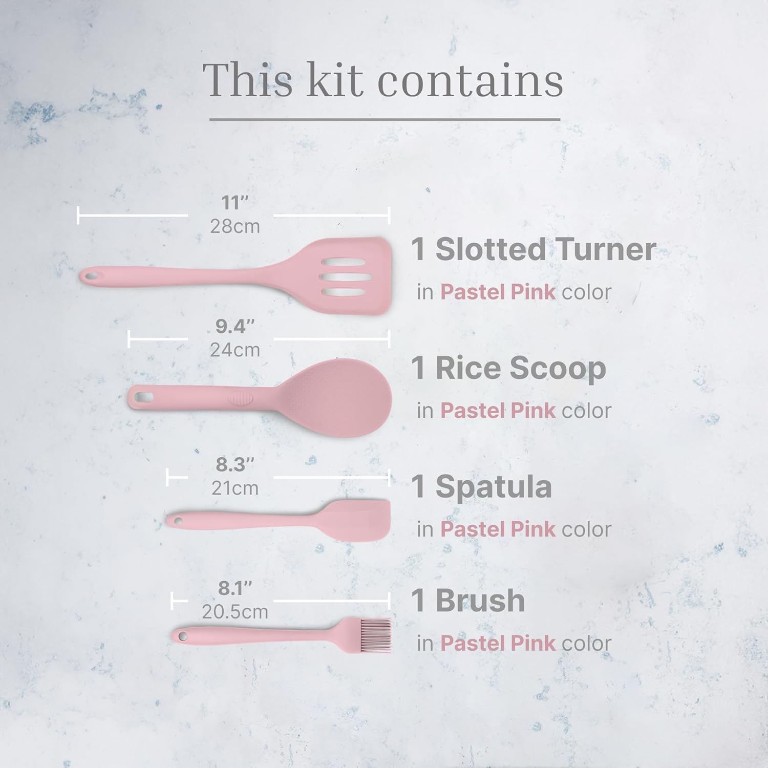 Silicone Utensils 4-Piece Set – Rubber Spatula, Pastry Brush, Slotted Turner, and Rice Paddle – Complete Heat-Resistant Set for Non-Stick Cookware – Kitchen Tools for Cooking and Baking – Pastel Pink