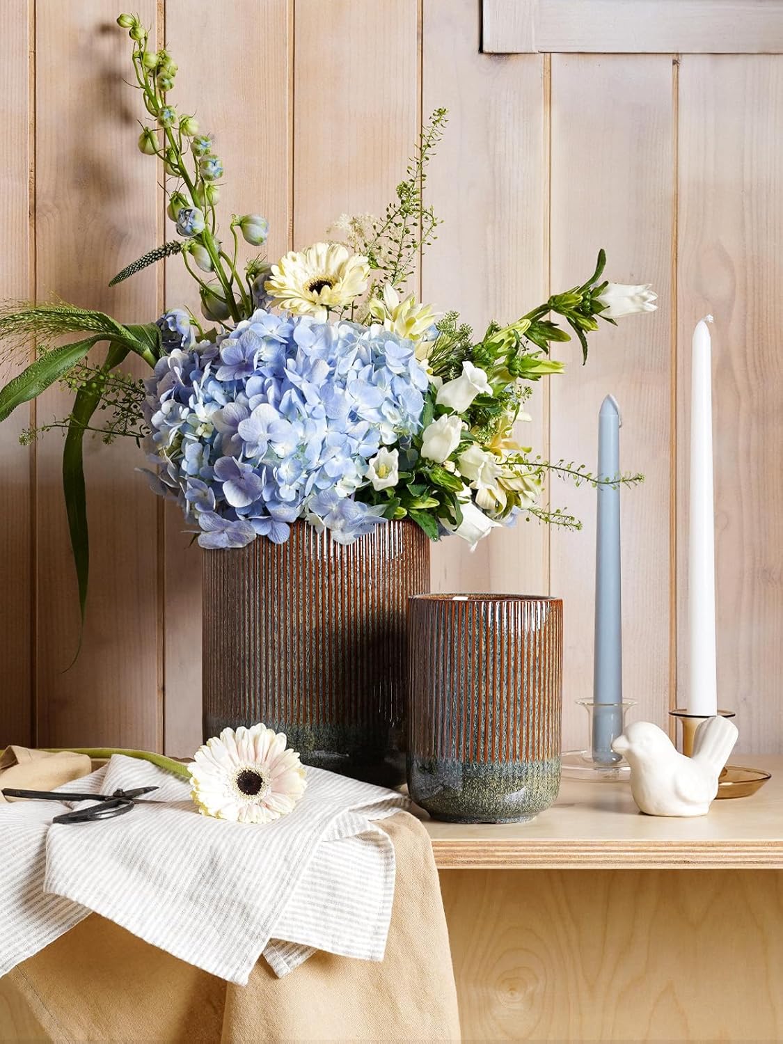 - Thoughtfully Sized, Set of 2: Our utensil holder set includes 2 carefully proportioned holders for your kitchen accessories; The larger holder, measuring H7.3" x D6", is designed to comfortably store around 15 spatulas or utensils; The smaller holder, at H5.4" x D3.8", is suited for the organized arrangement of up to 10 sets of flatware; Say hello to a well-organized cooking space