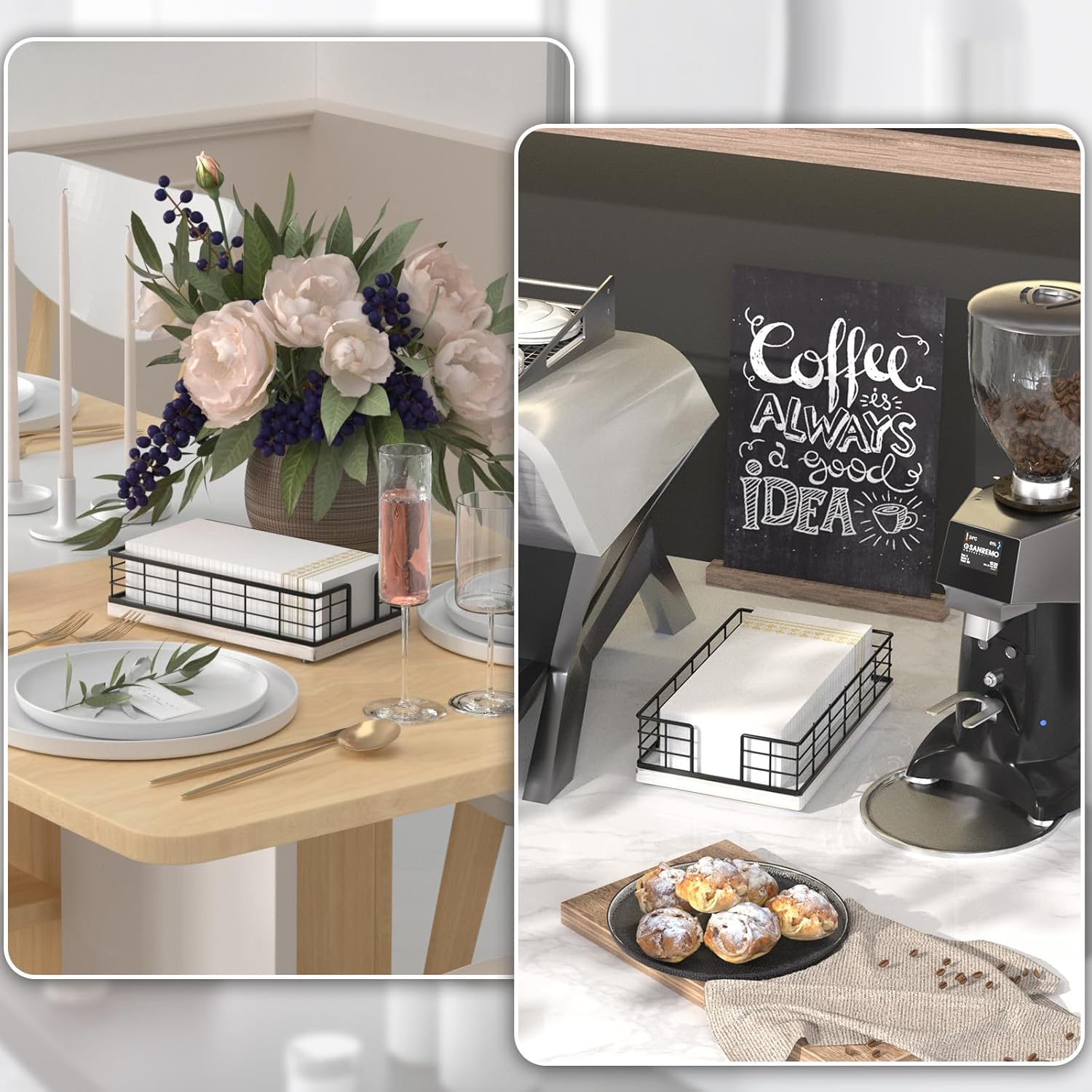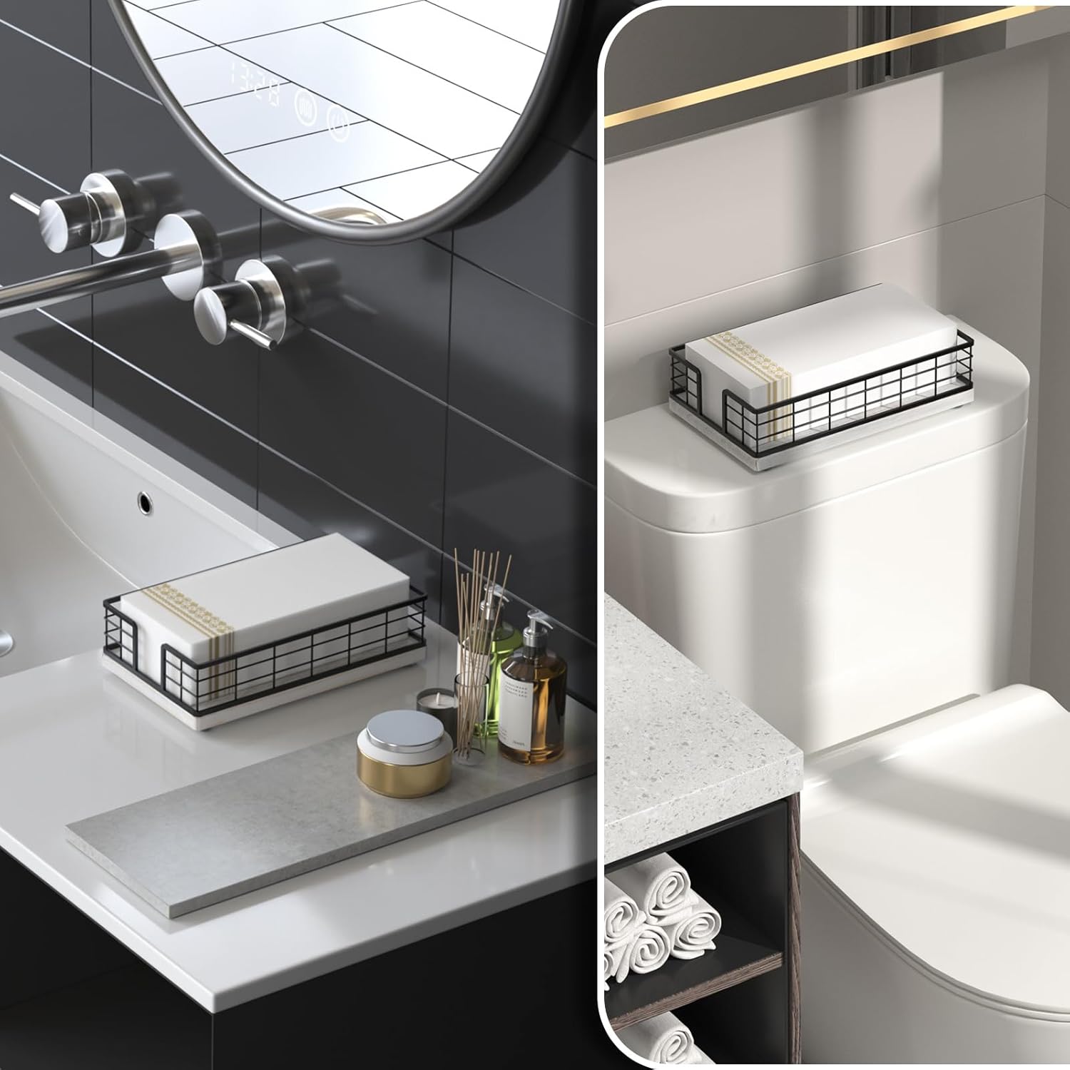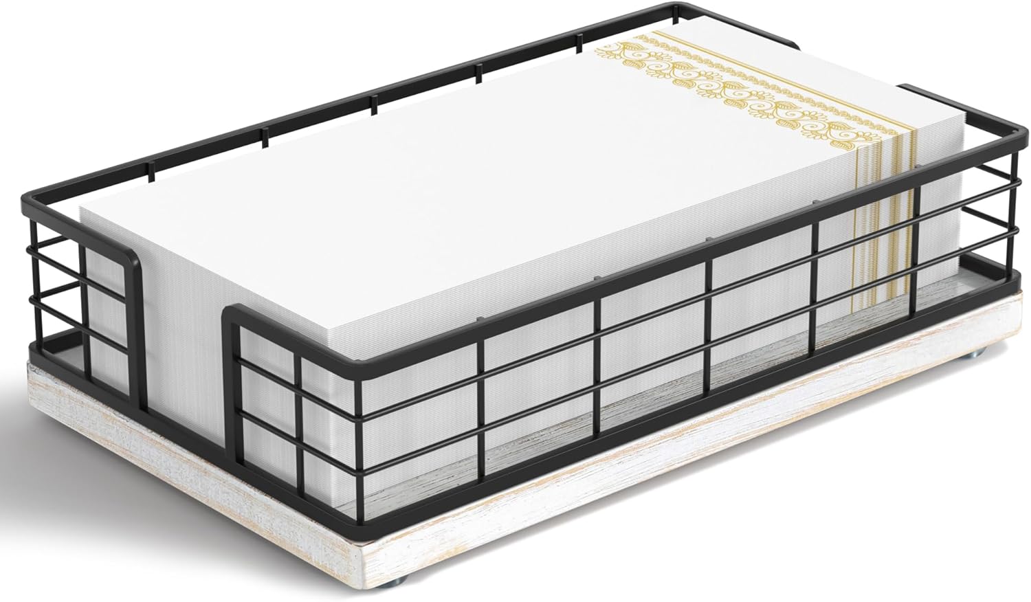 Wican Guest Towel Holder Tray for Bathroom, Oak and Iron Napkins Holder for Powder Room Dinning Table Wooden Basket for Disposable Paper Hand Towels Black and Farmhouse White