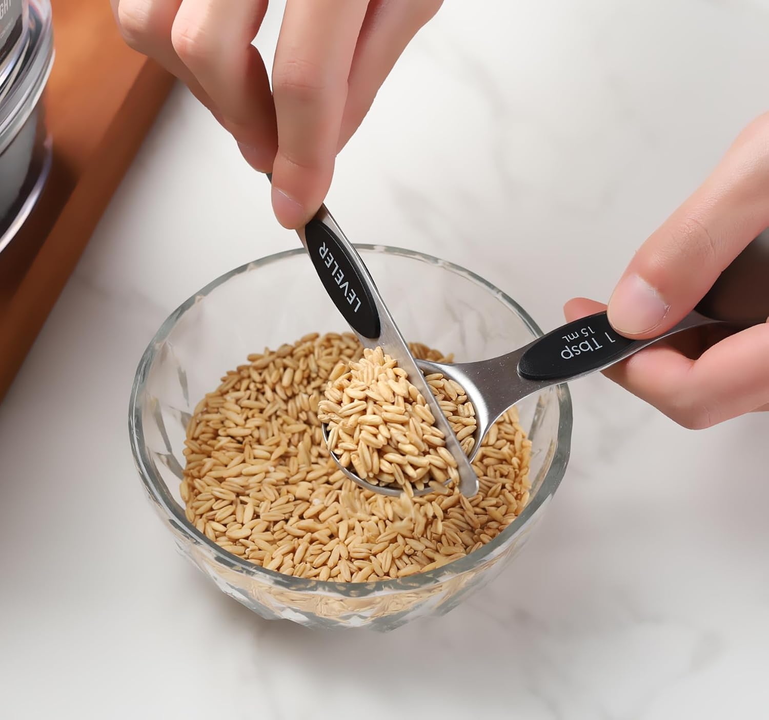 - 【Magnetic Measuring Cup and Spoon Set】The stainless steel magnetic measuring cups and spoons set includes 7 magnetic measuring cups, 8 Double Sided magnetic measuring spoons and 1 Leveler. Many different sizes from small to large for cooking or baking, measuring dry or liquid ingredients.It is a set of effective kitchen measurement tools that will allow you to utilize your cooking skills and make every delicious meal in a fun way.